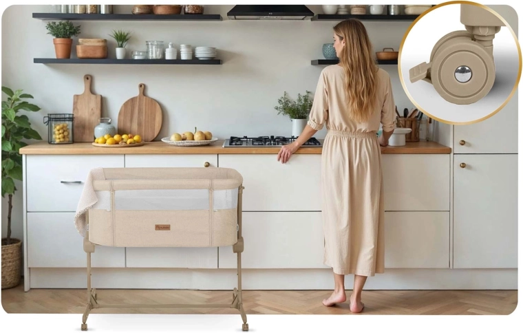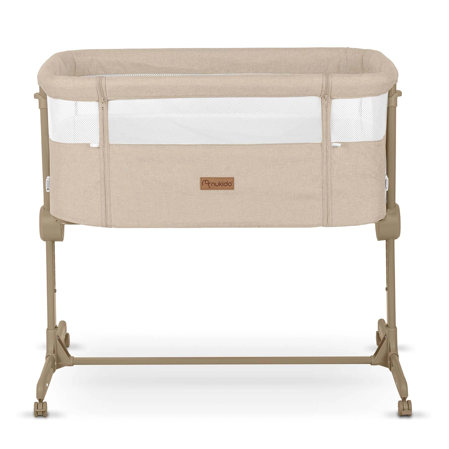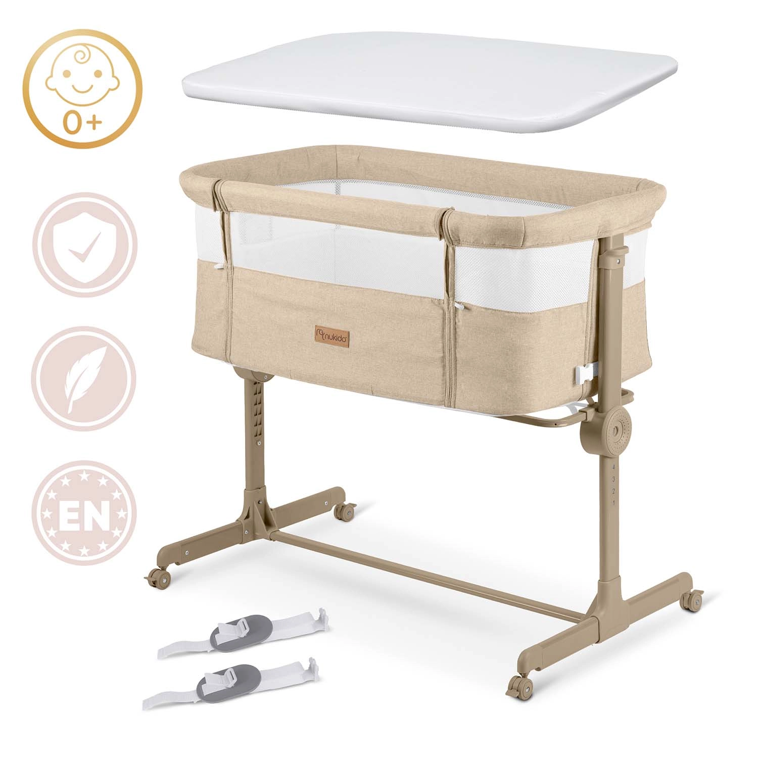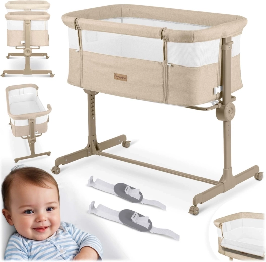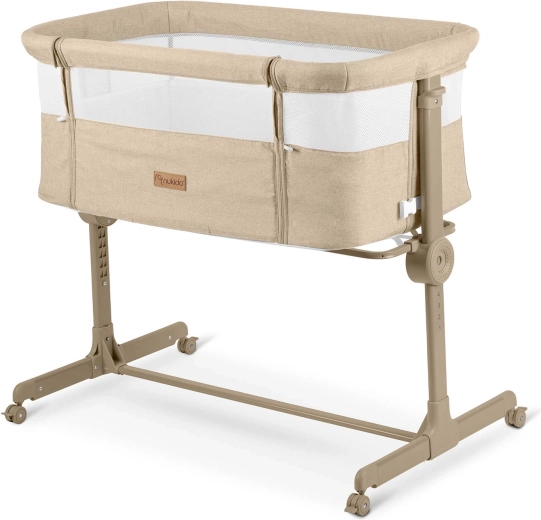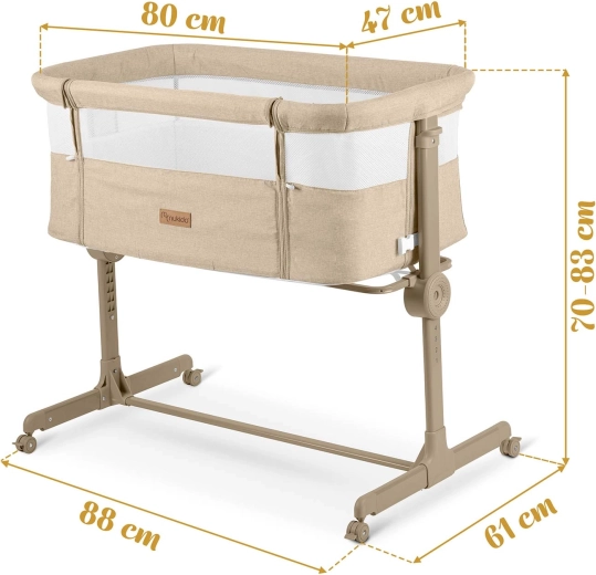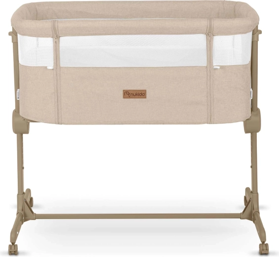A NUKIDO praktikus, újszülötteknek szánt oldalsó kiságya ötvözi a biztonságos közös alvást az éjszakai gondoskodás kényelmével. Mindkét oldalon független magasságállítást (1–7), lélegző hálós oldalfalakat, összecsukható vázat és 4 fékezhető kereket kínál. A csomag része a mosható huzatú matrac és a rögzítőpántok a szülői ágyhoz való biztonságos rögzítéshez.