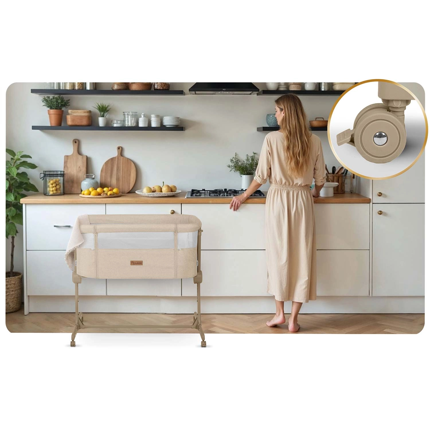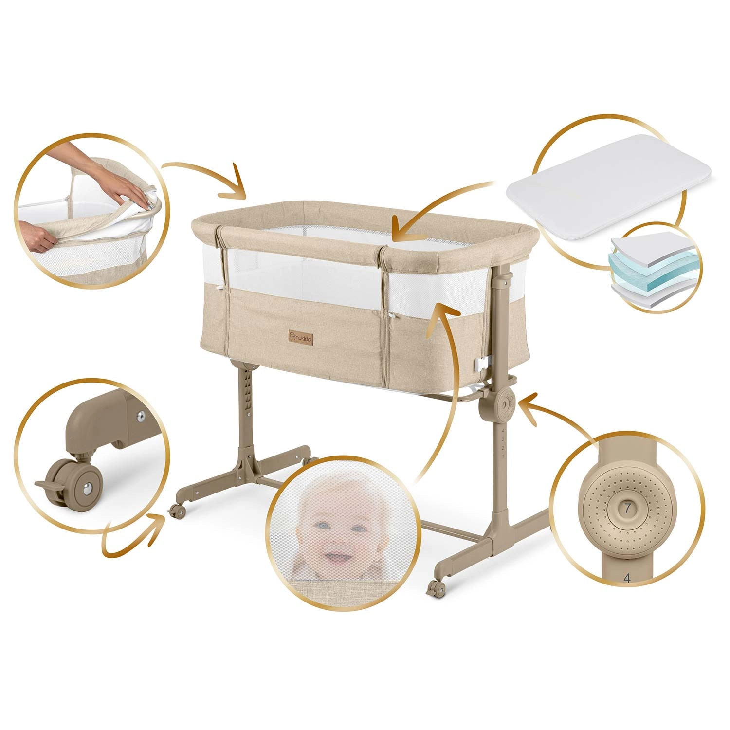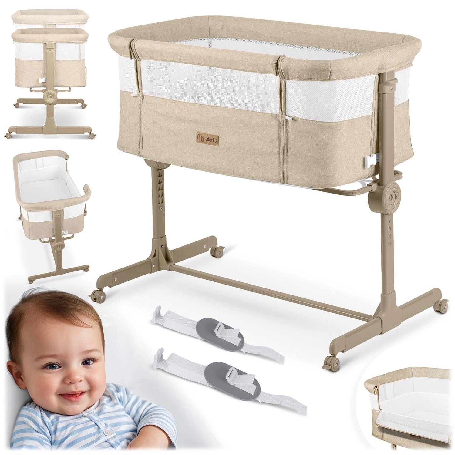 A NUKIDO praktikus, újszülötteknek szánt oldalsó kiságya ötvözi a biztonságos közös alvást az éjszakai gondoskodás kényelmével. Mindkét oldalon független magasságállítást (1–7), lélegző hálós oldalfalakat, összecsukható vázat és 4 fékezhető kereket kínál. A csomag része a mosható huzatú matrac és a rögzítőpántok a szülői ágyhoz való biztonságos rögzítéshez.