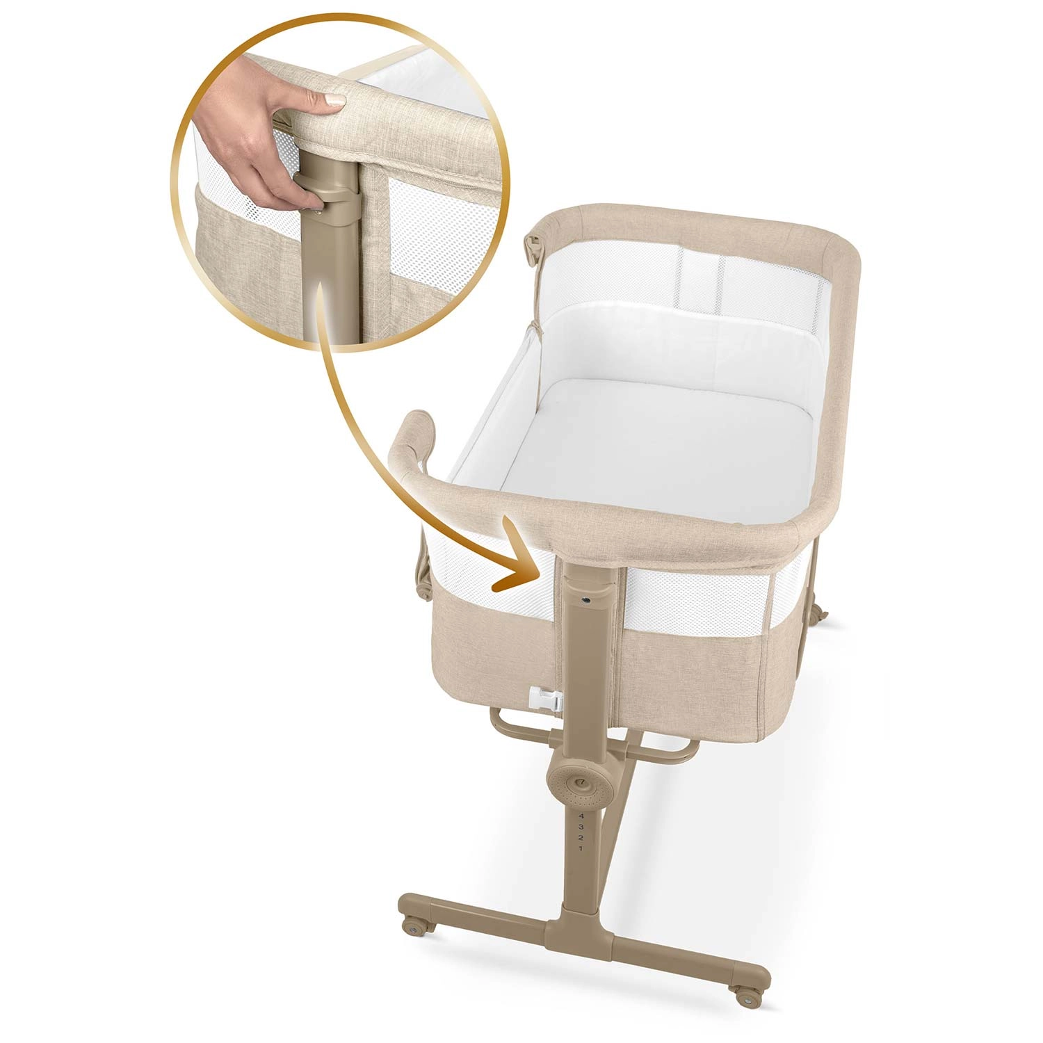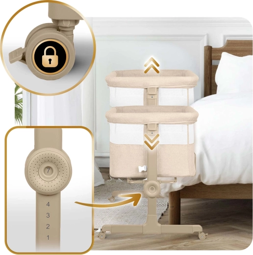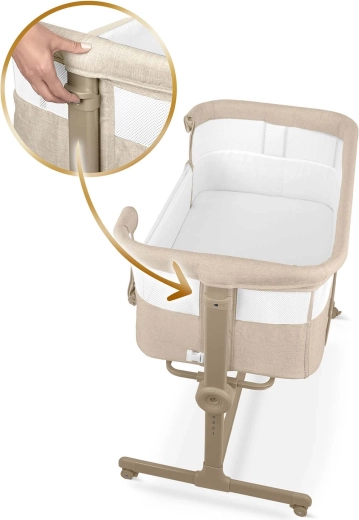 Mindkét oldal külön állítható. Könnyedén a szülői ágy matracának szintjéhez igazítható, vagy enyhe dőlésszög alakítható ki a baba nagyobb kényelméért.