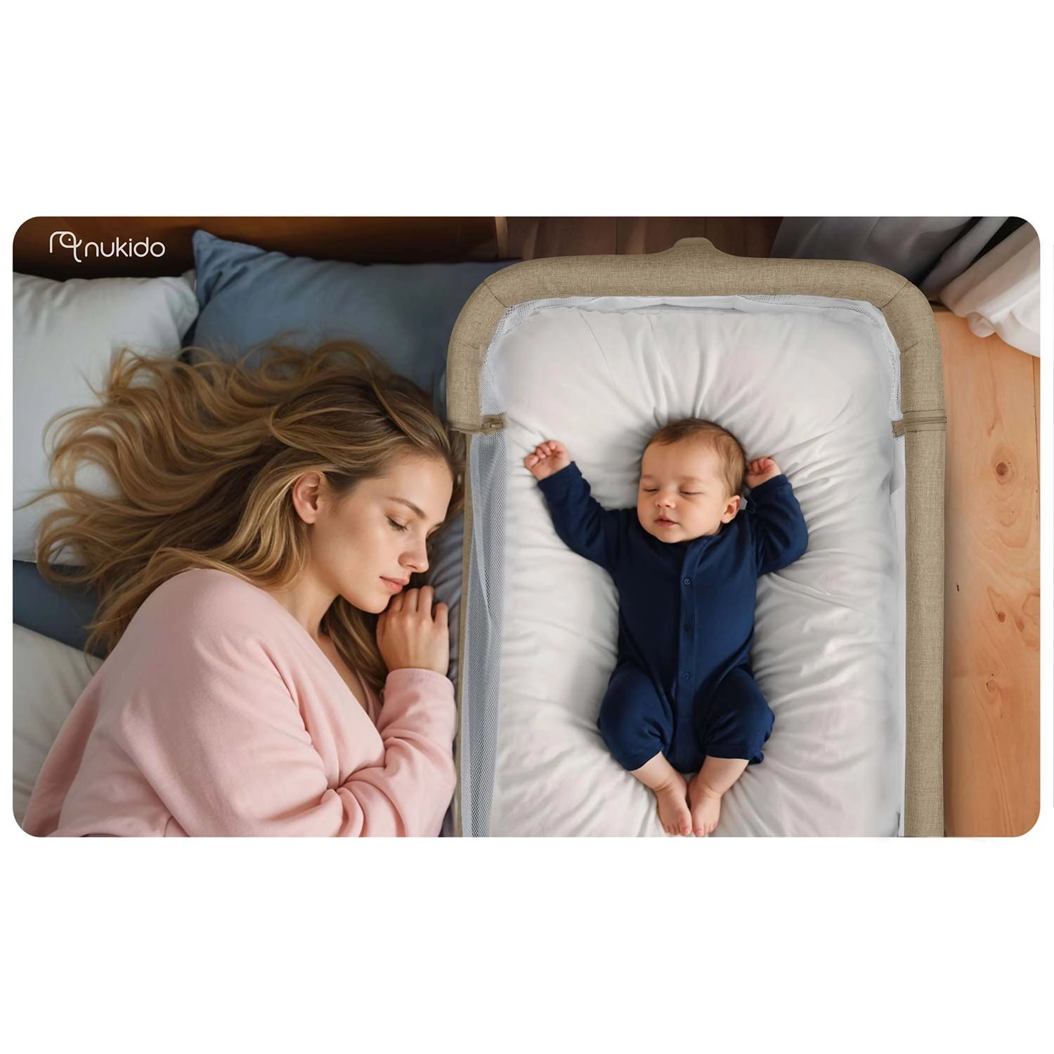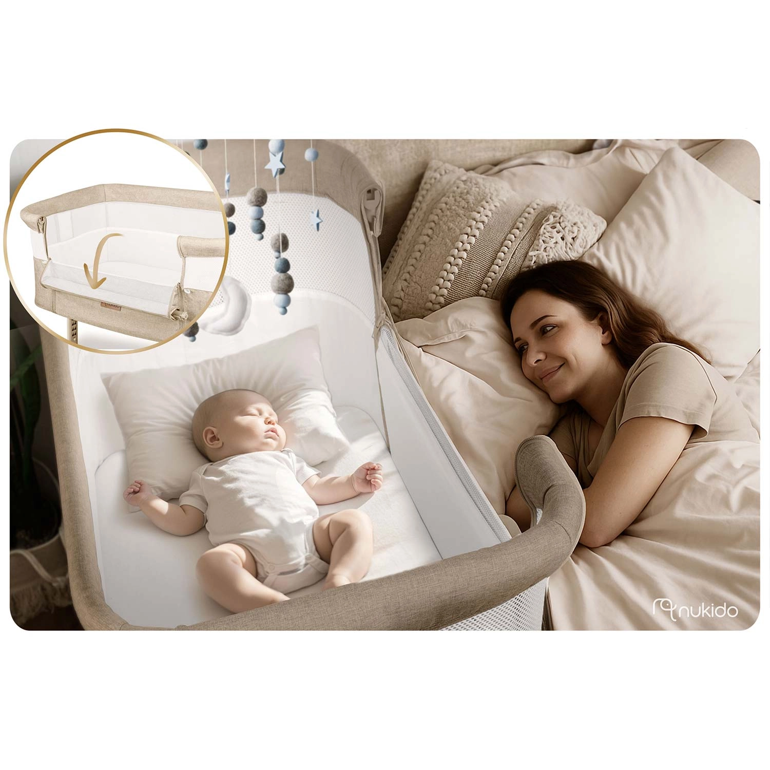 Rögzítse biztonságosan a kiságyat a saját ágyához, és élvezze a nyugodtabb éjszakákat. A NUKIDO oldalsó kiságy stabil vázzal, lélegző hálós oldalakkal a jobb légáramlásért és kiváló rálátással a babára érkezik. A kétoldali, független magasságszabályzásnak köszönhetően könnyen a szülői matrac szintjére igazítható, vagy finom lejtés alakítható ki, ami például reflux esetén is segíthet.