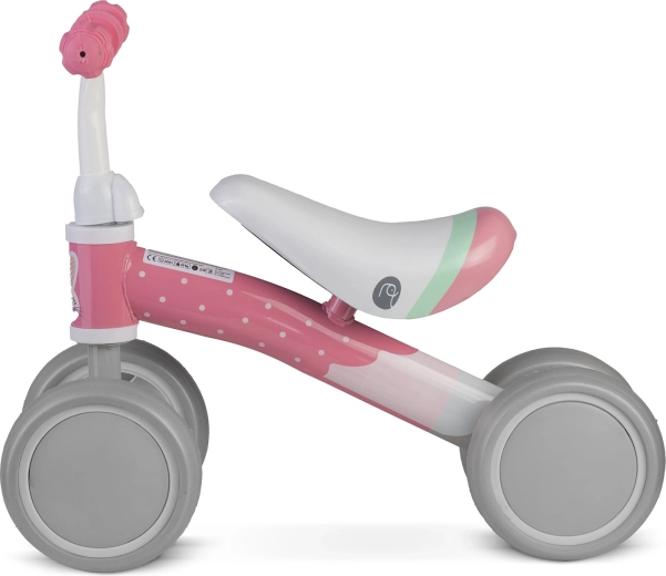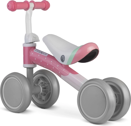 A RICOKIDS futóbicikli ideális választás az első lépésekhez a kerékpározás világában. A négy széles keréknek köszönhetően rendkívül stabil, és természetes módon segíti az egyensúly elsajátítását felesleges esések miatti aggodalom nélkül. Az alacsony ülés és a könnyű szerkezet egyszerűvé teszi a fel- és leszállást, valamint a kormányzást, így a gyermek gyorsan megszokja az irányítást és a mozgáskoordinációt.