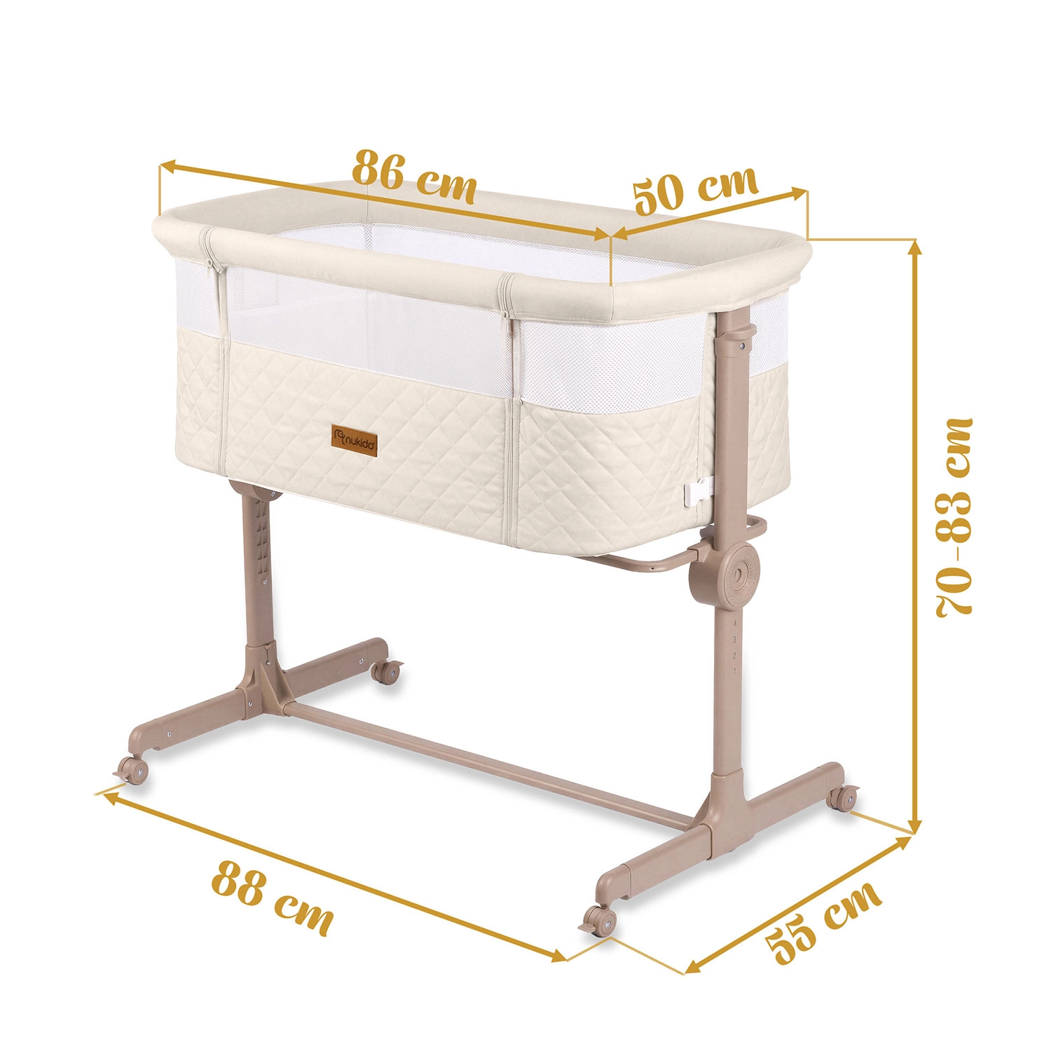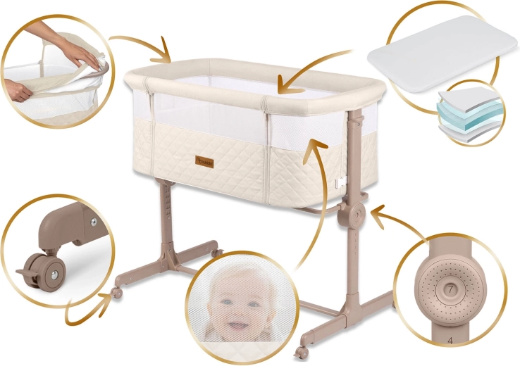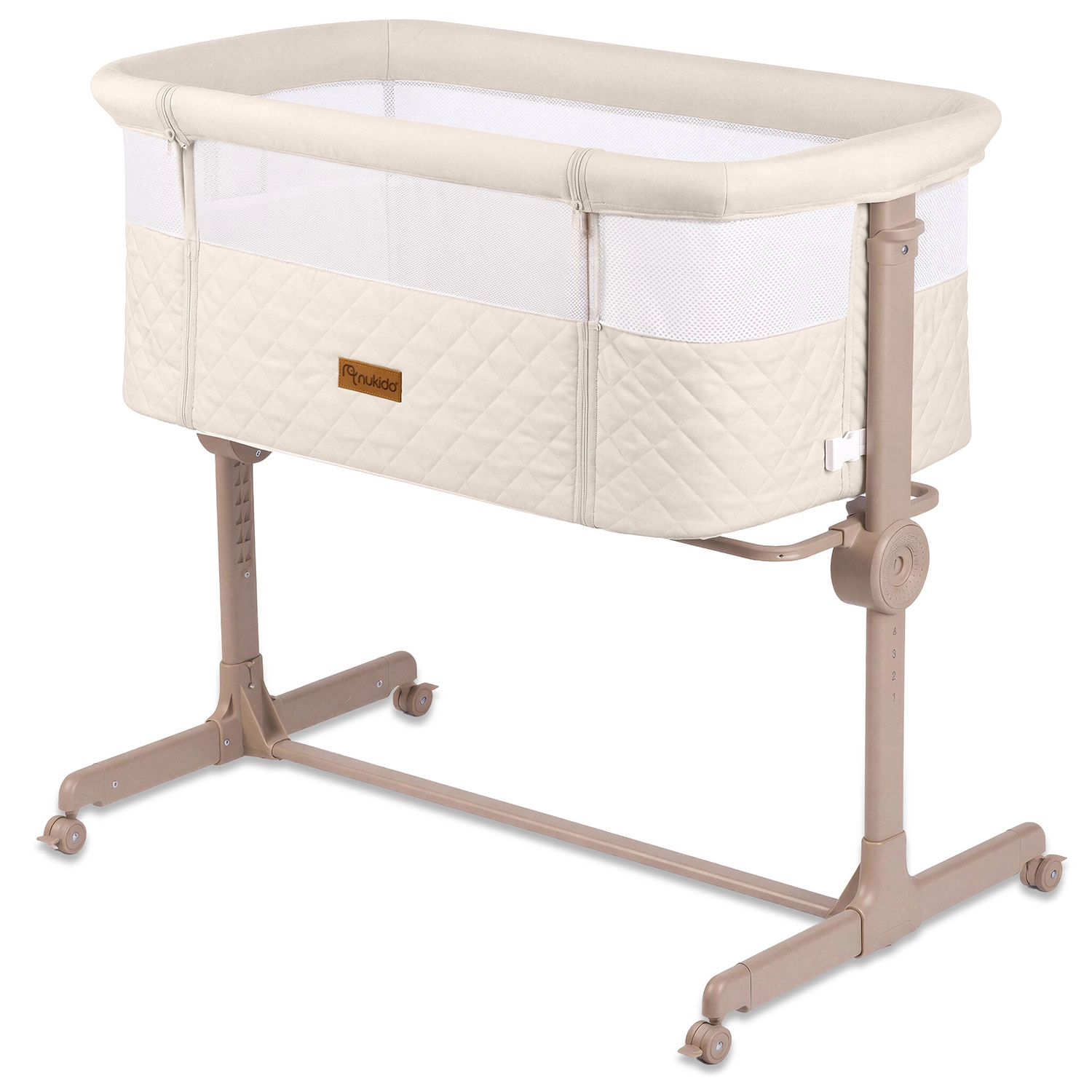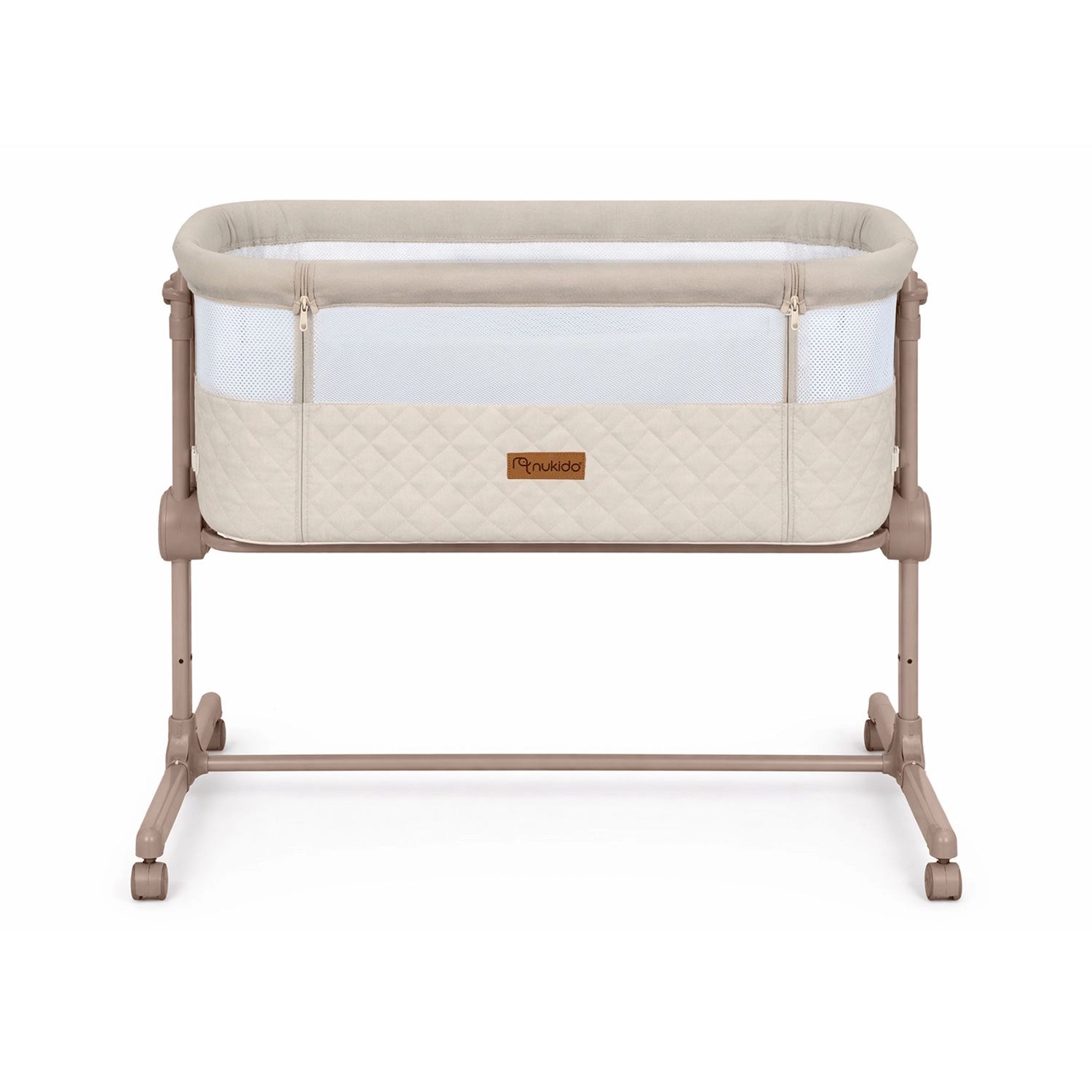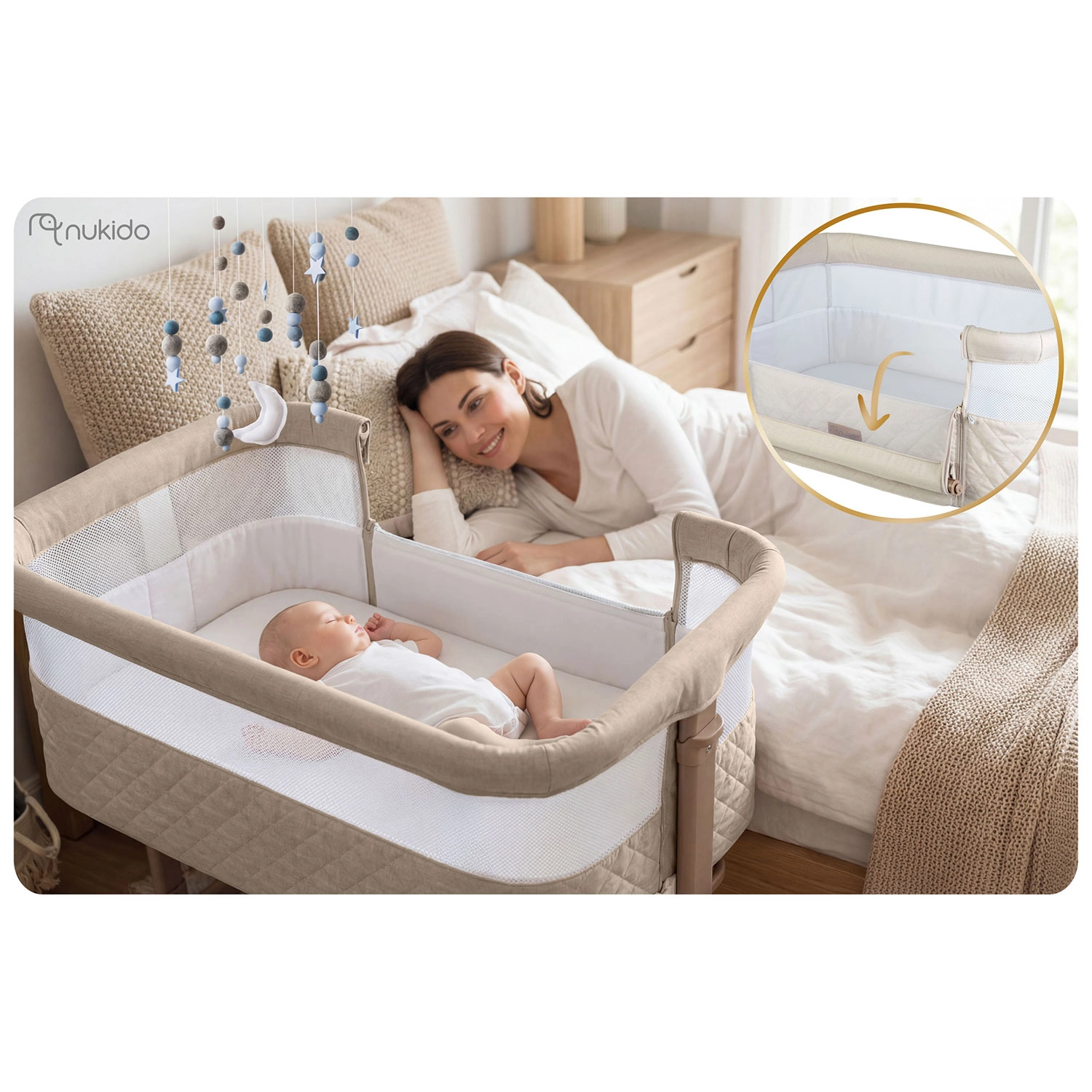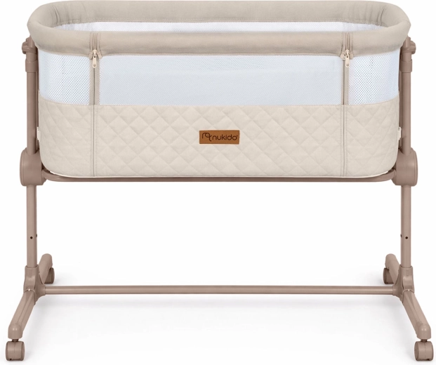 A NUKIDO praktikus és biztonságos oldalsó babaágya újszülötteknek 7 magassági szinttel, a két oldal független döntésével a kényelemért és reflux esetén is, cipzáros, levehető oldalpanelel az éjszakai könnyű hozzáféréshez, valamint 4 fékezhető kerékkel a lakáson belüli mozgatáshoz. Tartozék a matrac mosható huzattal és a szülői ágyhoz való biztonságos rögzítőpántok.