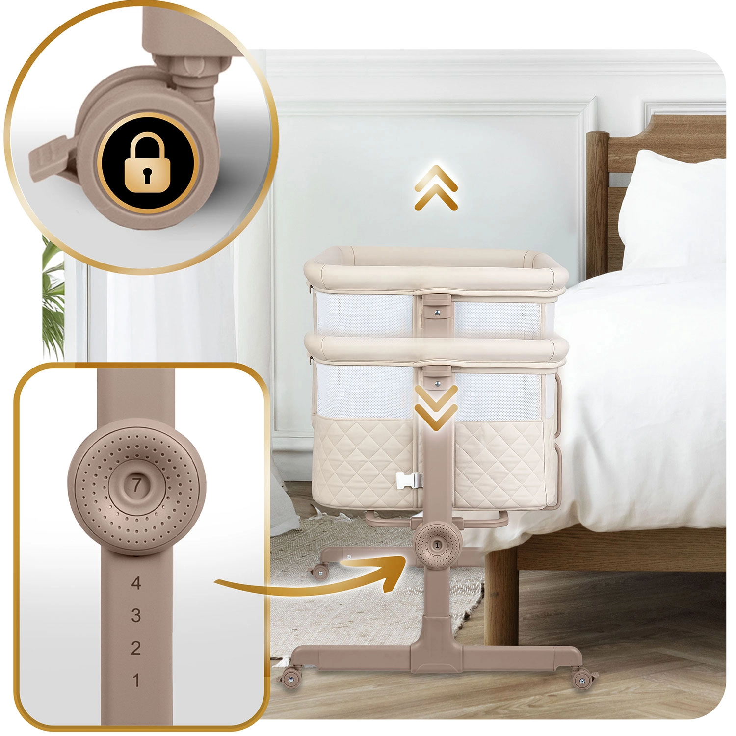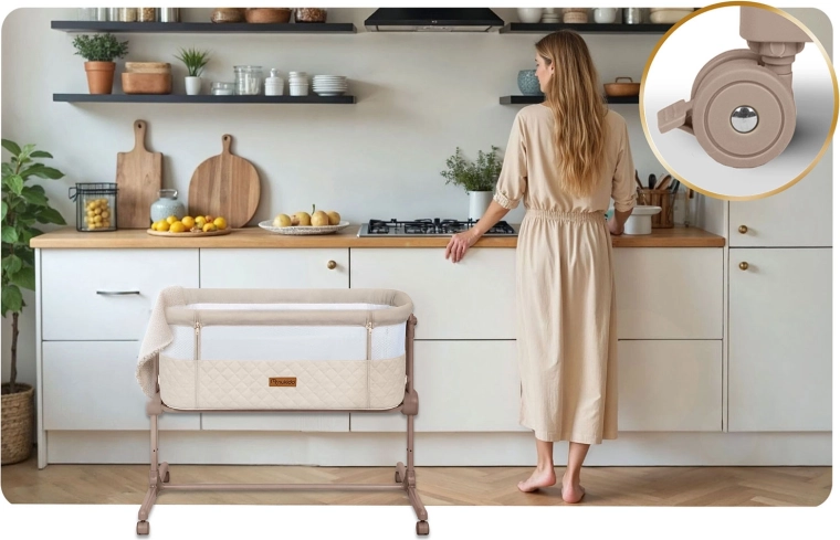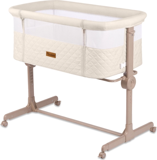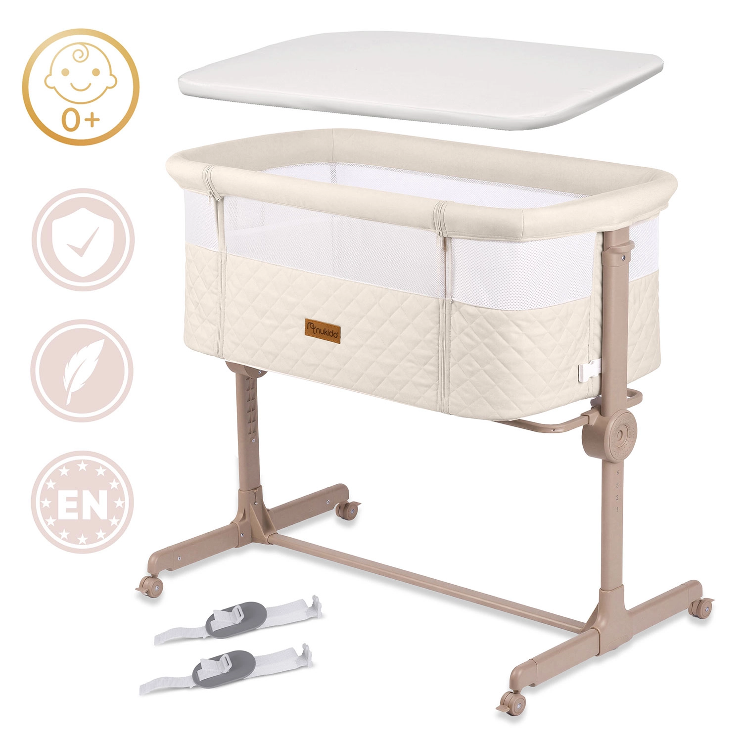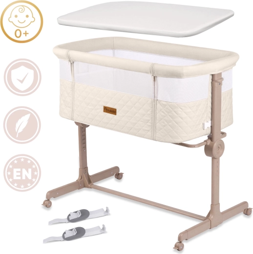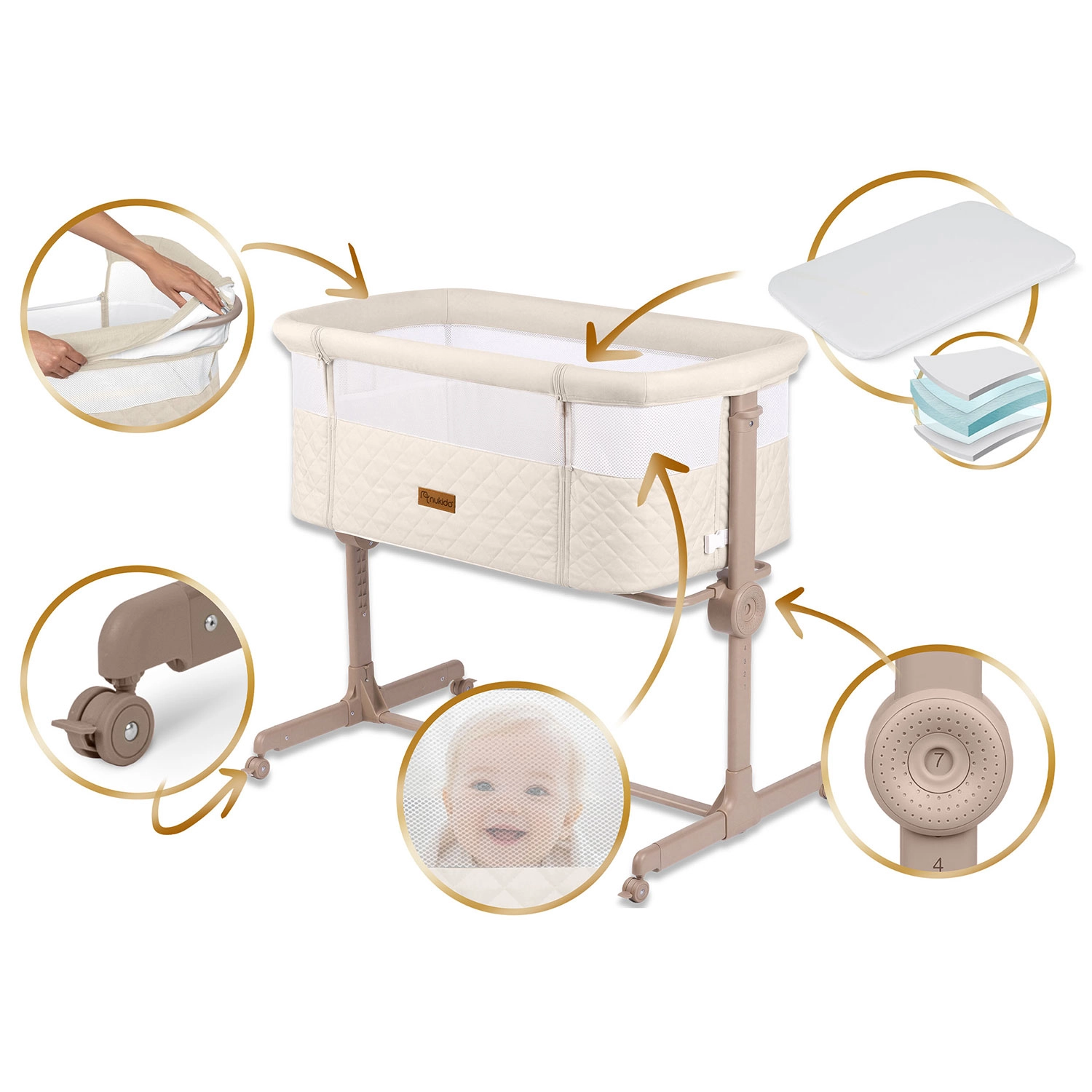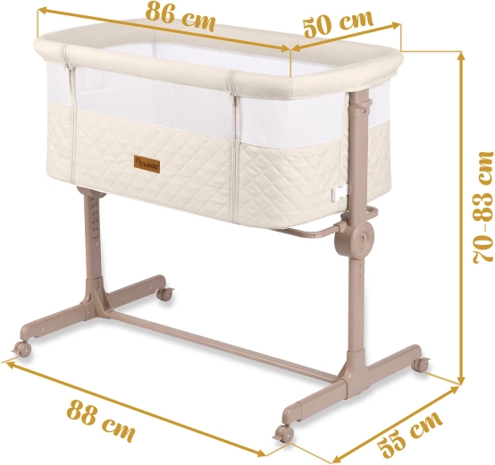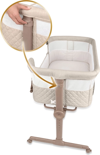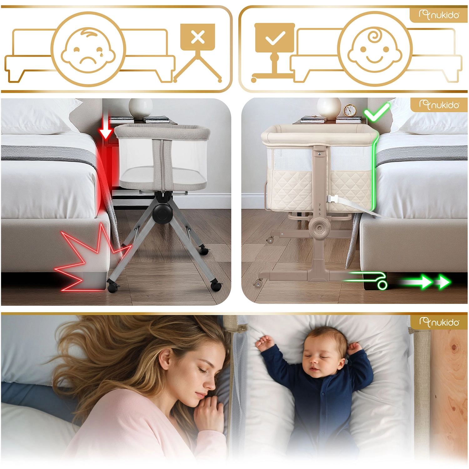 A NUKIDO praktikus és biztonságos oldalsó babaágya újszülötteknek 7 magassági szinttel, a két oldal független döntésével a kényelemért és reflux esetén is, cipzáros, levehető oldalpanelel az éjszakai könnyű hozzáféréshez, valamint 4 fékezhető kerékkel a lakáson belüli mozgatáshoz. Tartozék a matrac mosható huzattal és a szülői ágyhoz való biztonságos rögzítőpántok.