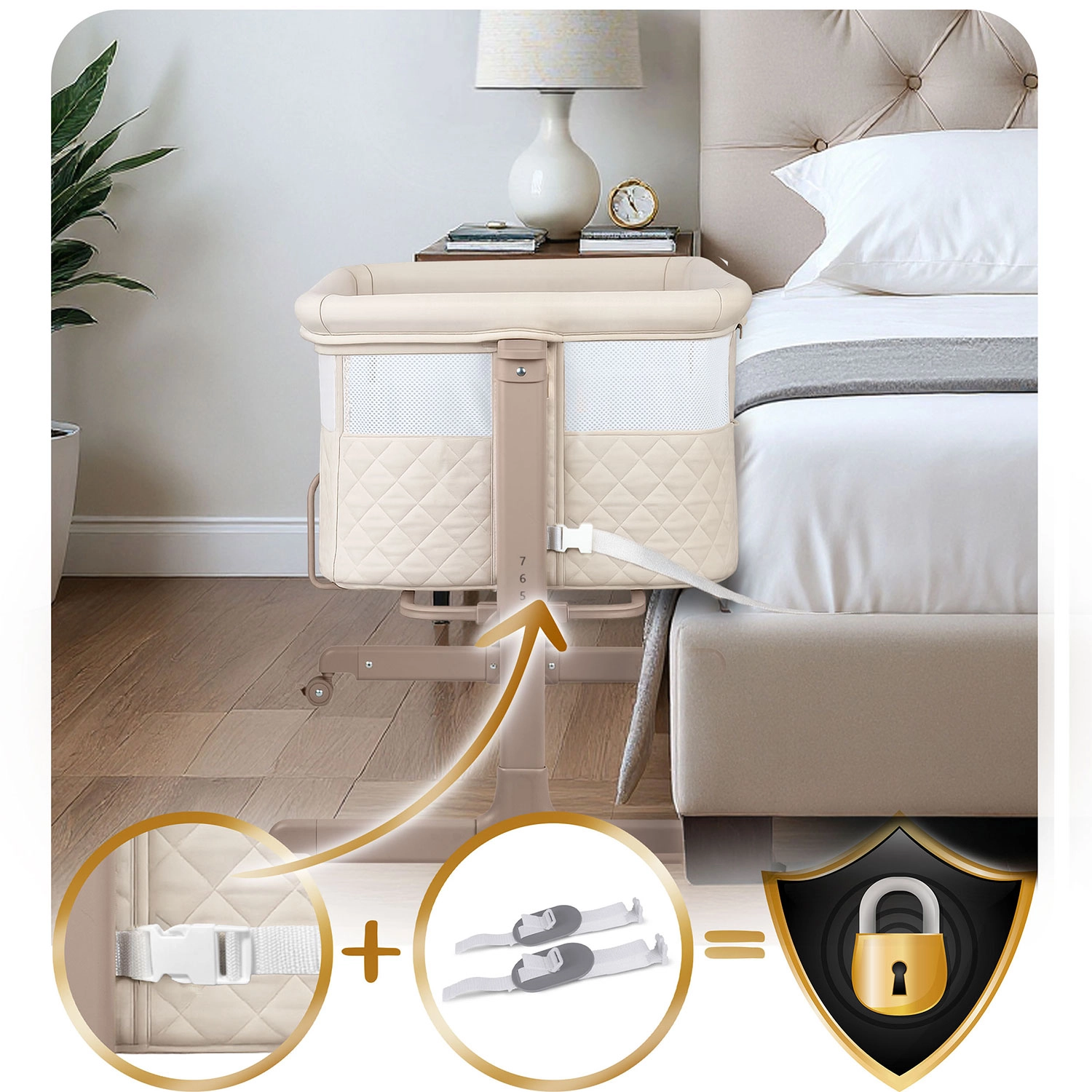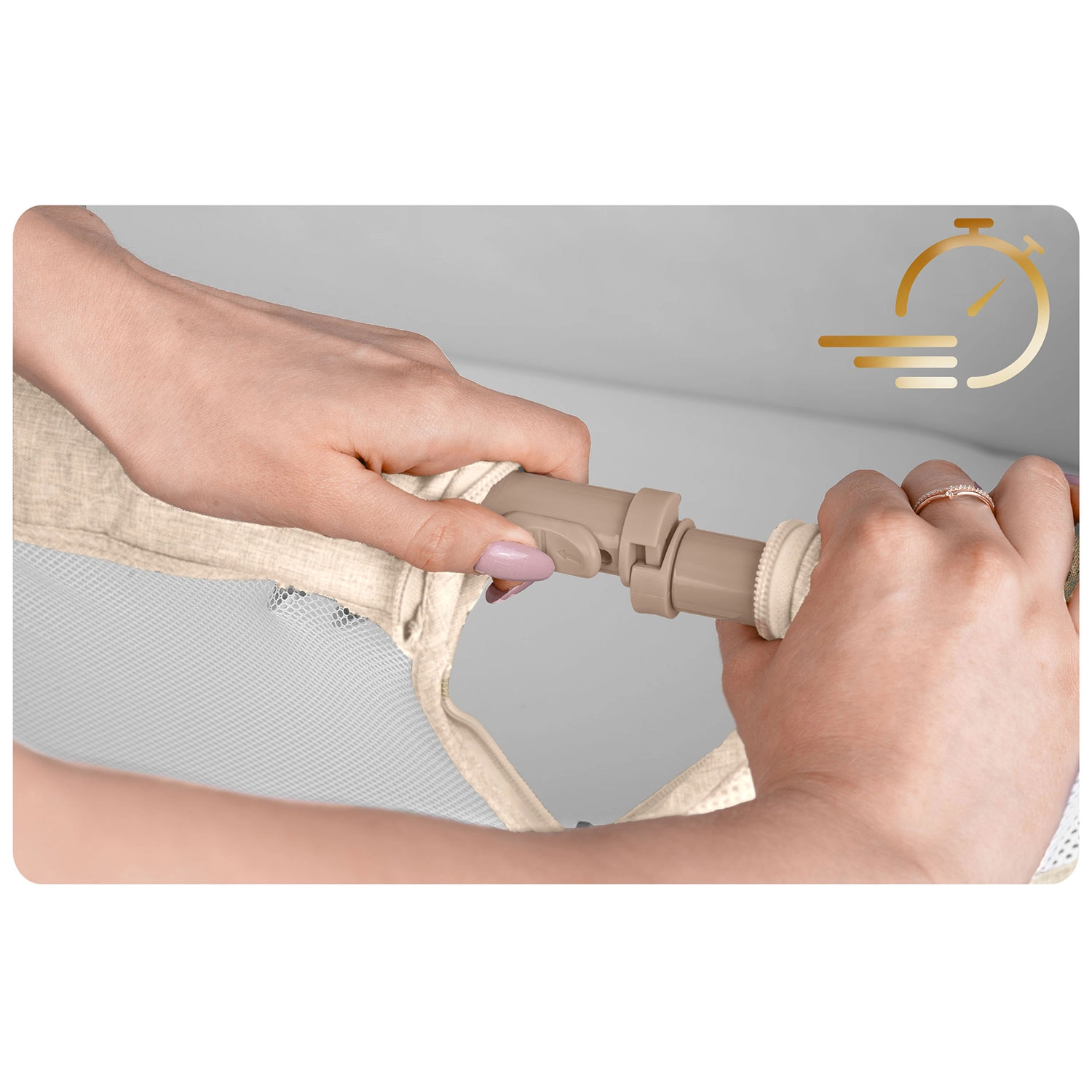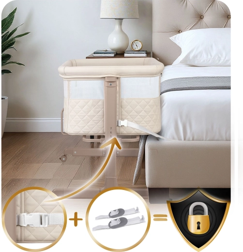 A cipzáros oldalpanel kifelé nyílik, hogy a baba ne tudja kinyitni. A rögzítőpántok szilárdan összekapcsolják a kiságyat a szülői ággyal a maximális stabilitásért.