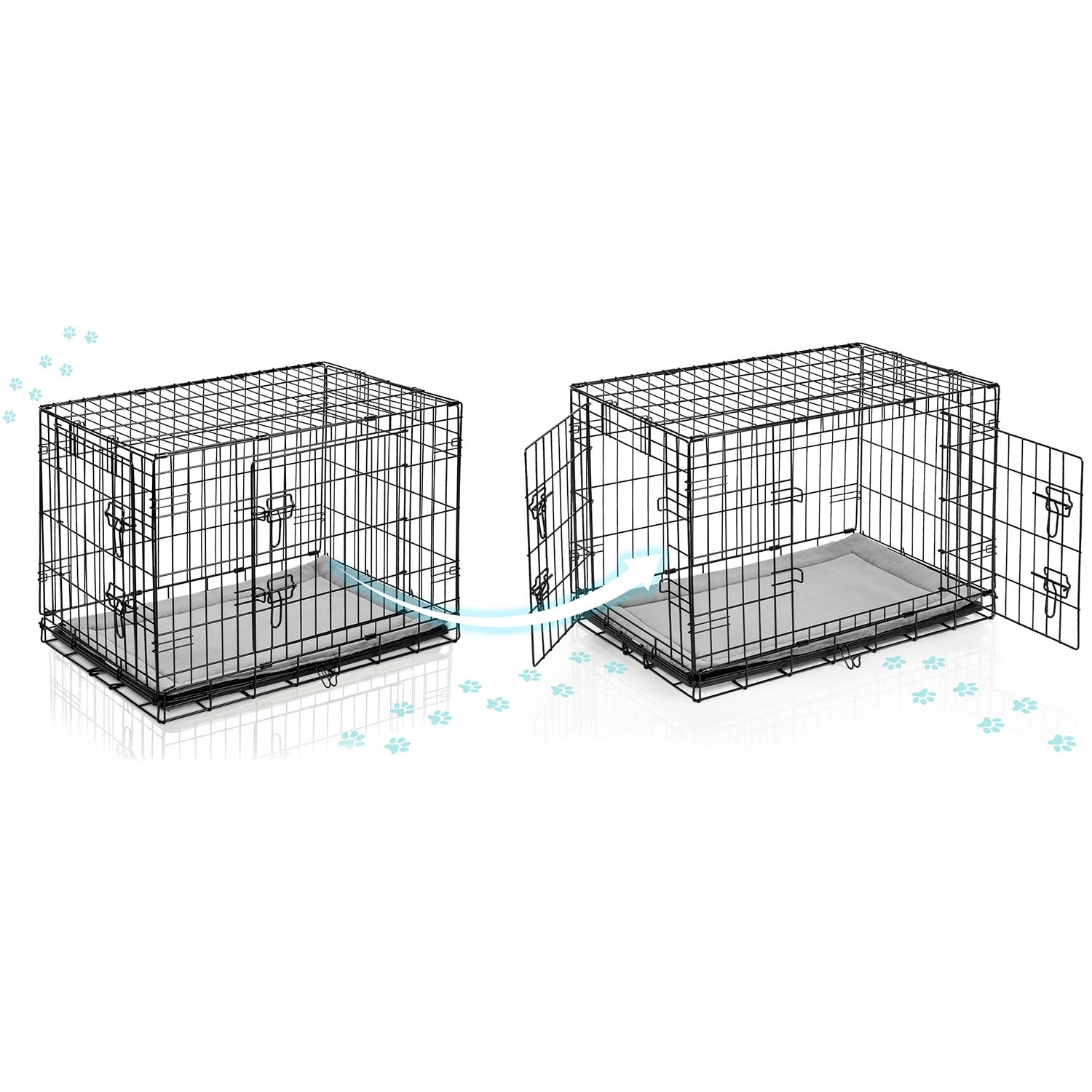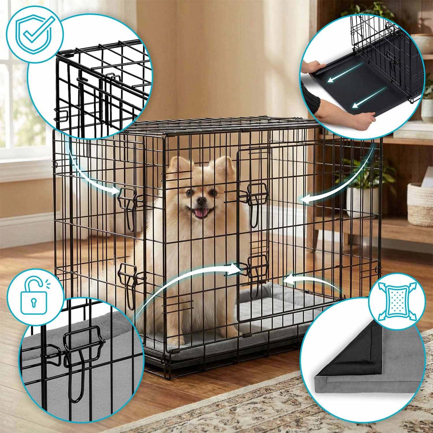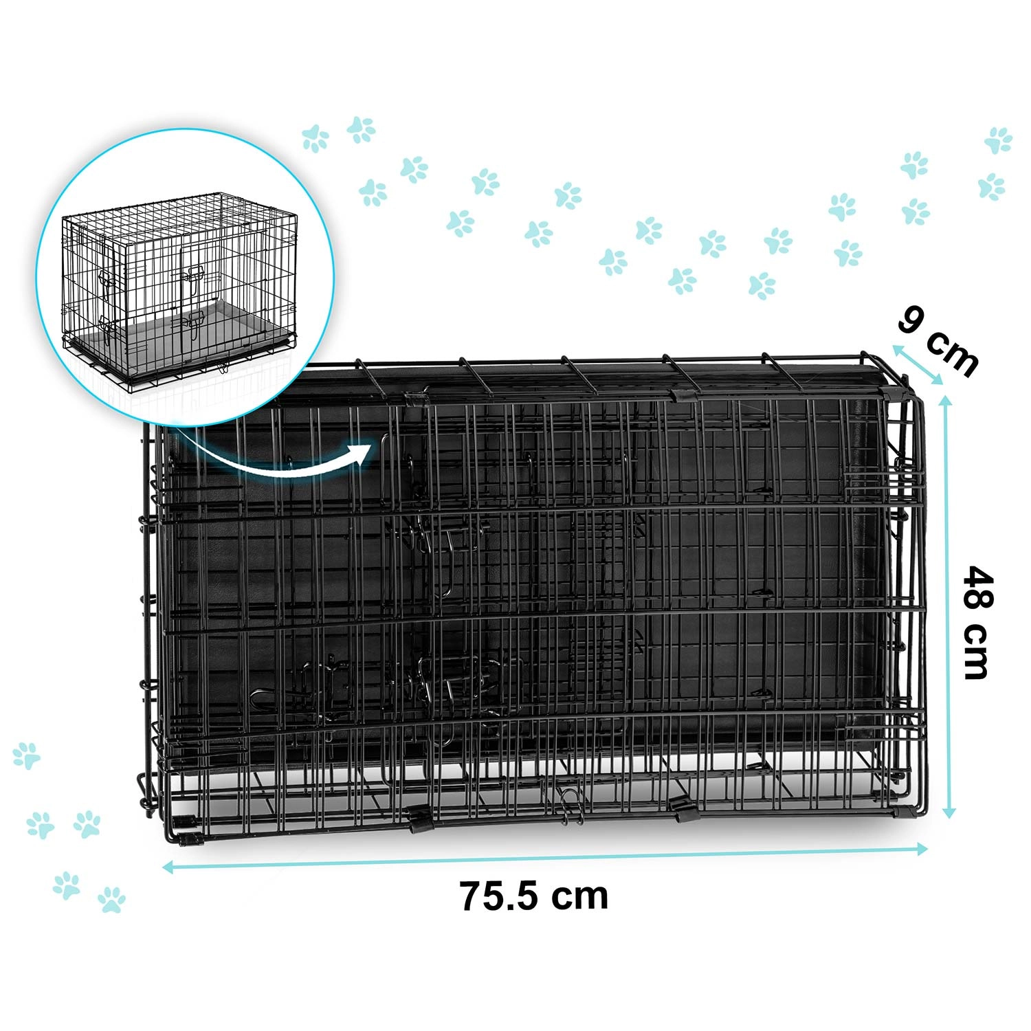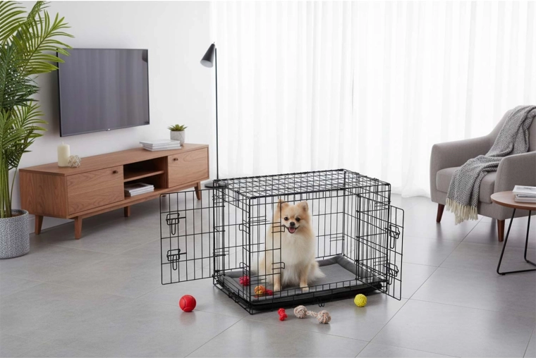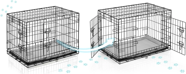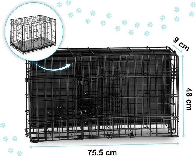 A ketrecet néhány másodperc alatt lapos, „bőröndszerű” formára csukhatja a praktikus füllel. A kivehető műanyag tálca lehetővé teszi a gyors tisztítást és a higiénia fenntartását otthon és útközben is. A dróthálós szerkezet jó légáramlást és átláthatóságot biztosít, ami segít csökkenteni a kutya stresszét.