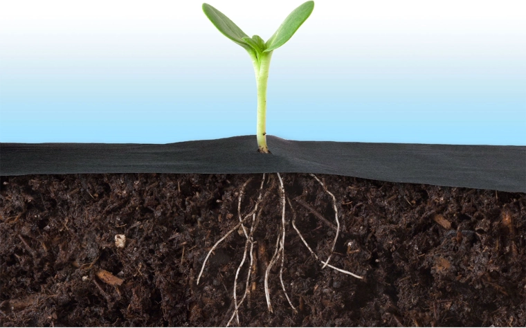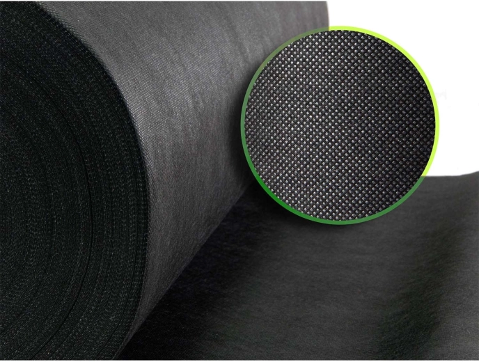 A sűrű nemszőtt textília hatékonyan gátolja a gyomok átnövését, megtartja a talajnedvességet, és ideális feltételeket teremt a növények növekedéséhez herbicidek használata nélkül.