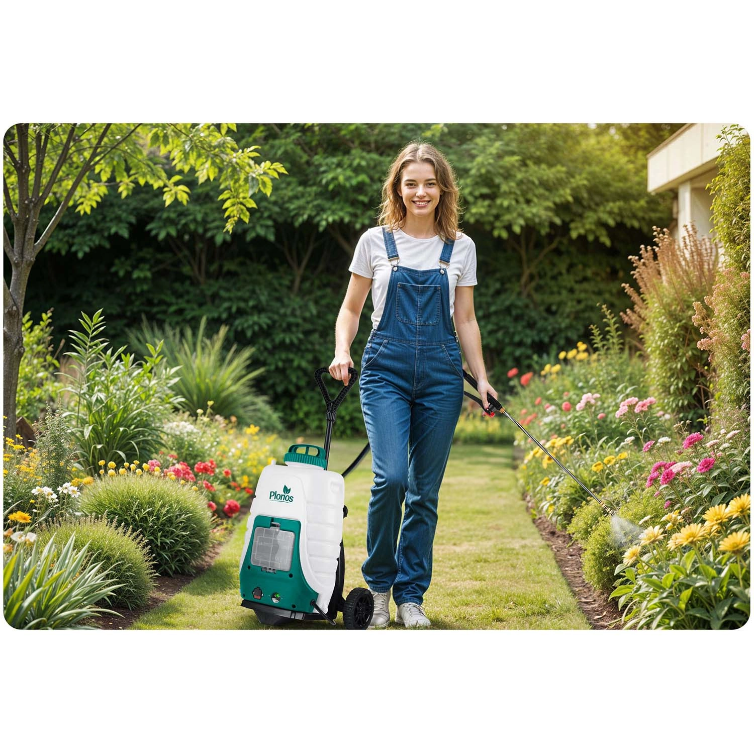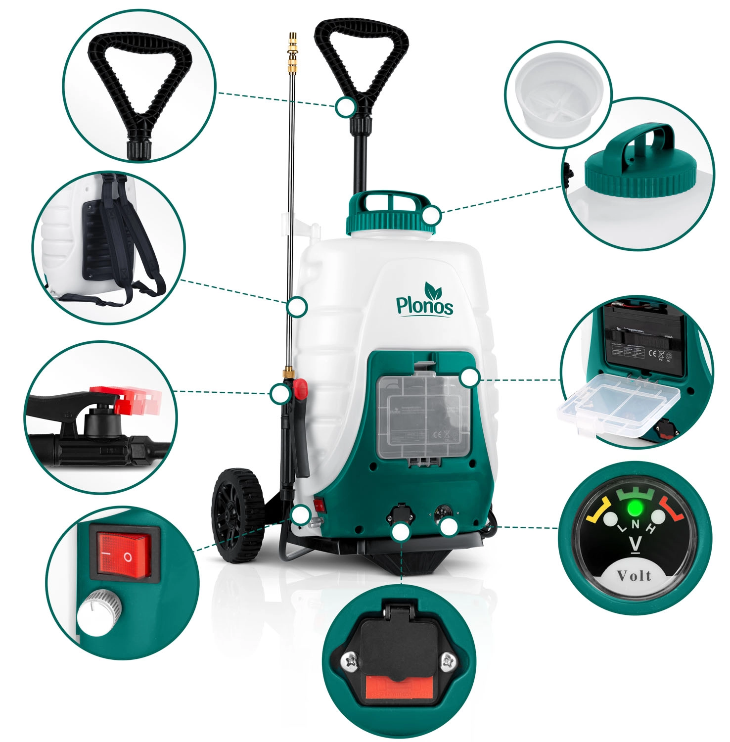 A Plonos akkumulátoros kerekes permetező a magas teljesítményt maximális kényelemmel ötvözi. A stabil alváz nagy kerekekkel, a teleszkópos fogantyú és a praktikus kiegészítőtartó zseb megkönnyíti a kezelést bármilyen terepen. A motor fordulatszám-szabályozása 2800–3200 ford./perc és a 0,10–0,45 MPa üzemi nyomás lehetővé teszi az ideális szóráskép beállítását az érzékeny növényektől az intenzív alkalmazásokig.