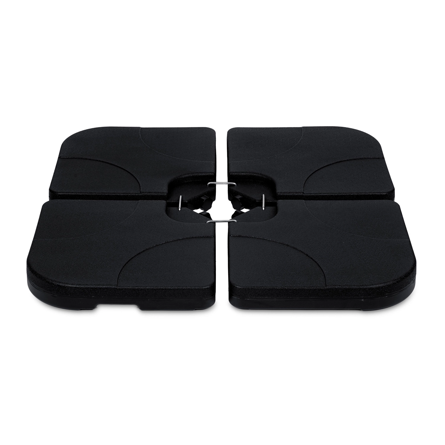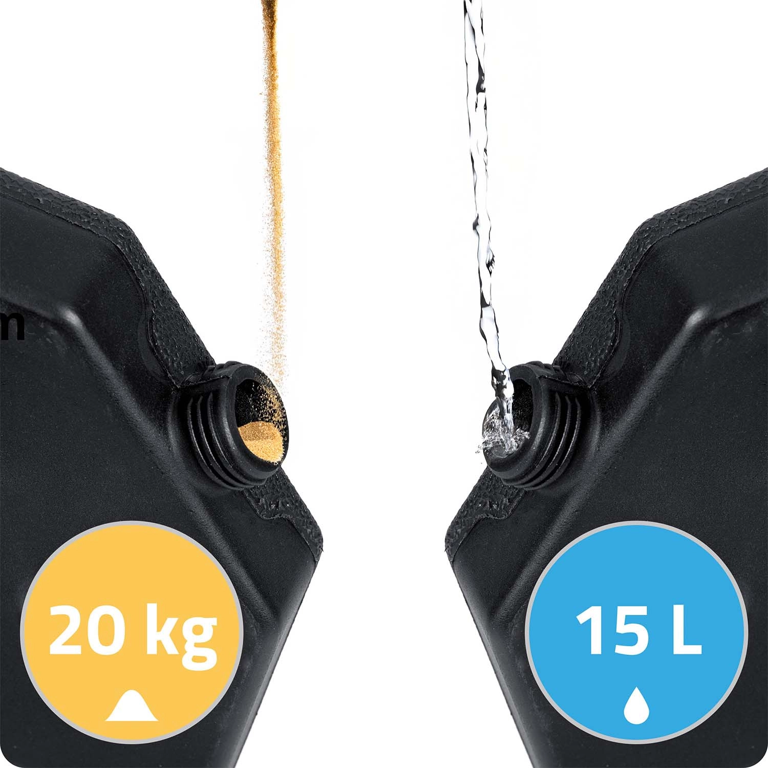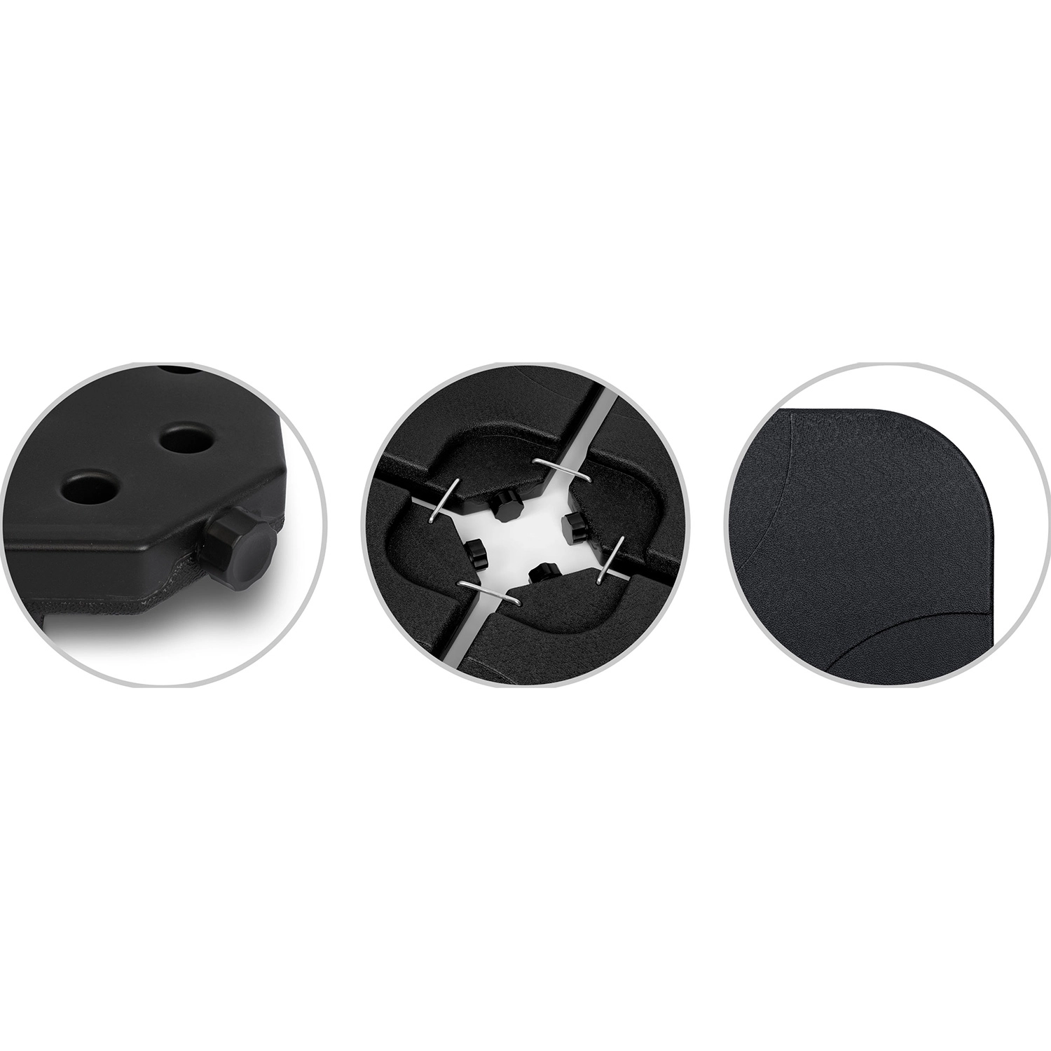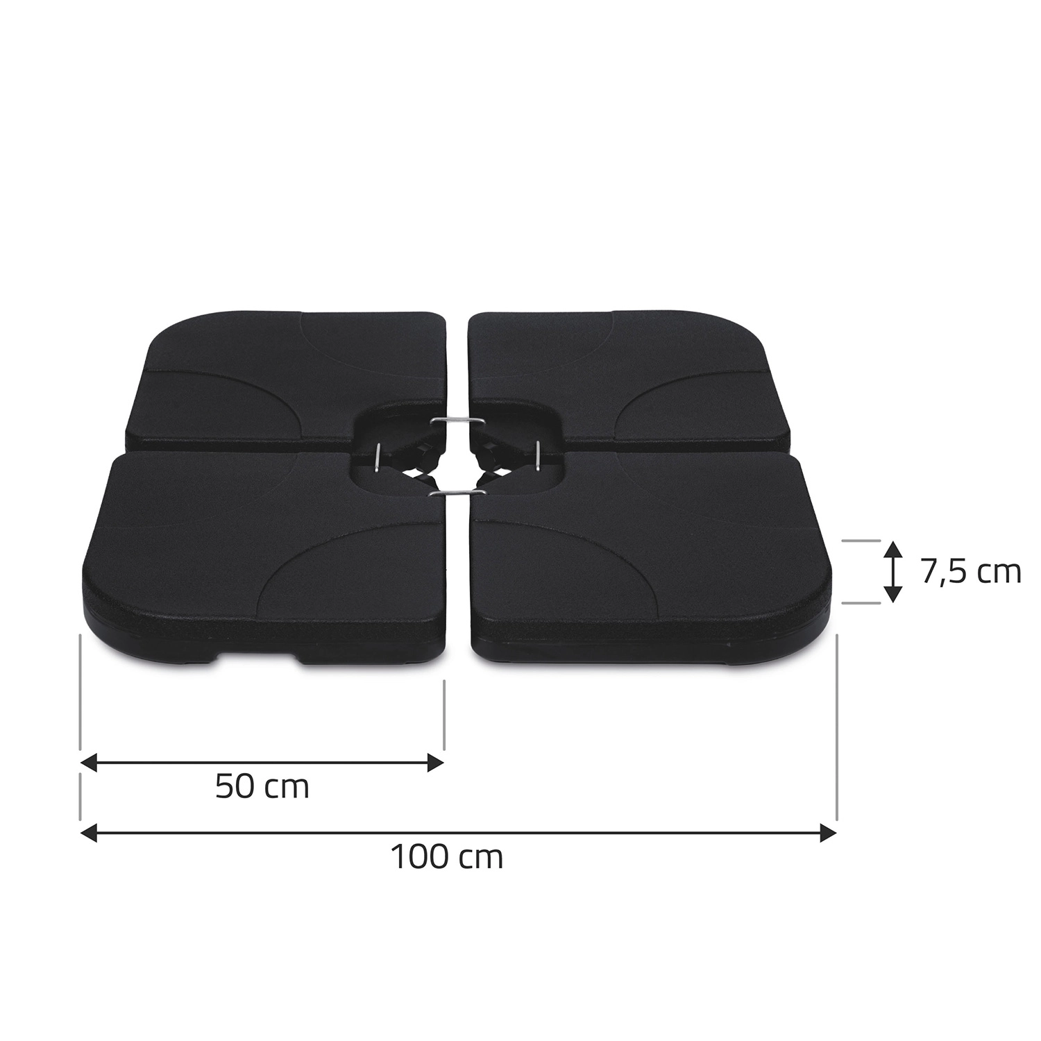 A négy, egymáshoz kapcsolható szegmens körbefogja a napernyő kereszt talpát, és kompakt, nehéz alapot hoz létre. A vízzel (legfeljebb 4 × 15 l) vagy homokkal (legfeljebb 4 × 20 kg) történő feltöltésnek köszönhetően egyszerűen kiválaszthatja az ideális terhelést a különböző időjárási körülményekhez. A HDPE anyag könnyű a kezeléshez, ugyanakkor magas ellenállást nyújt a mechanikai sérülésekkel szemben.