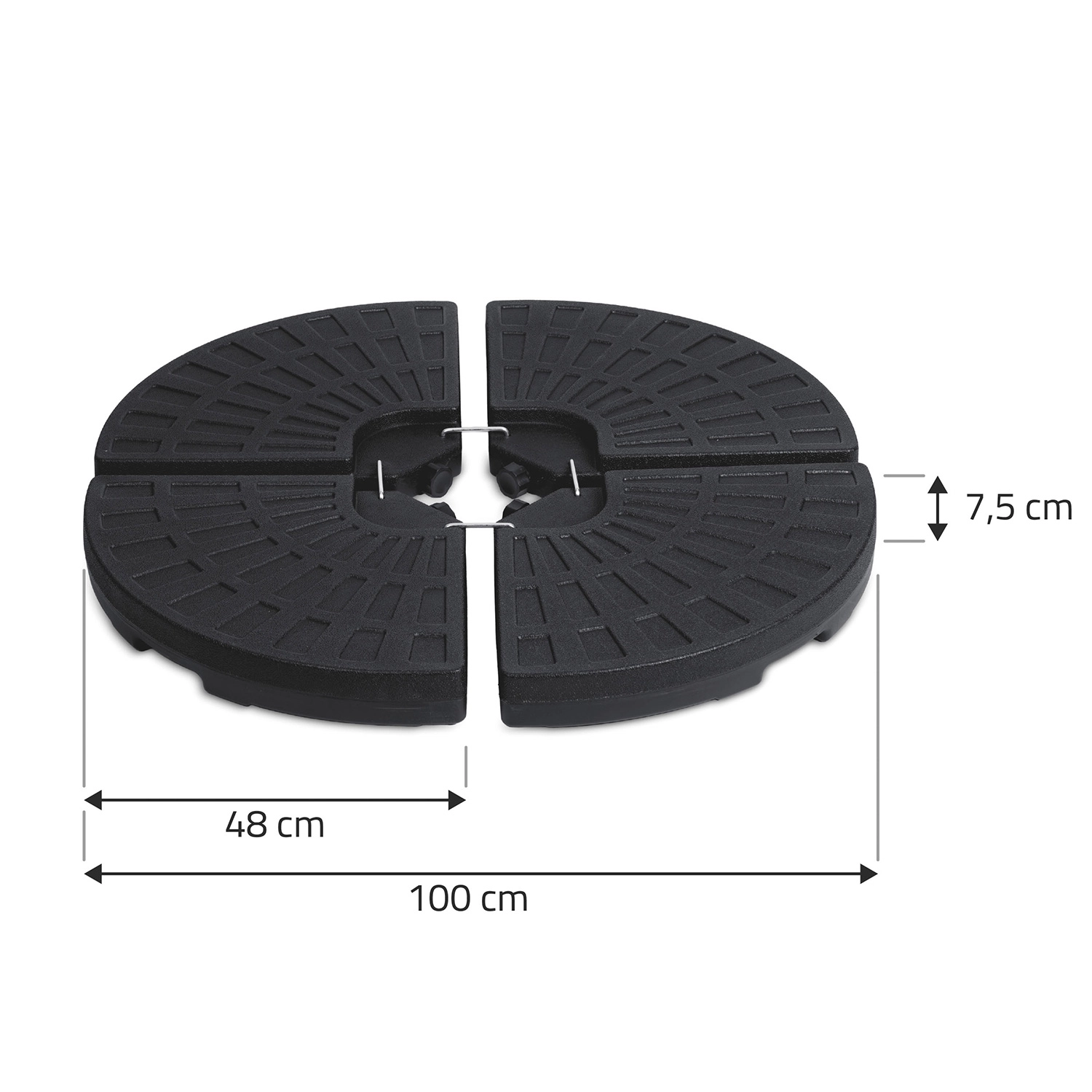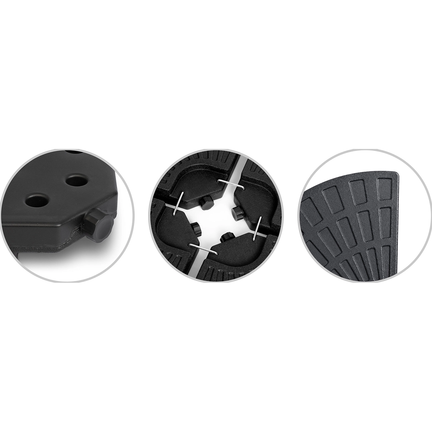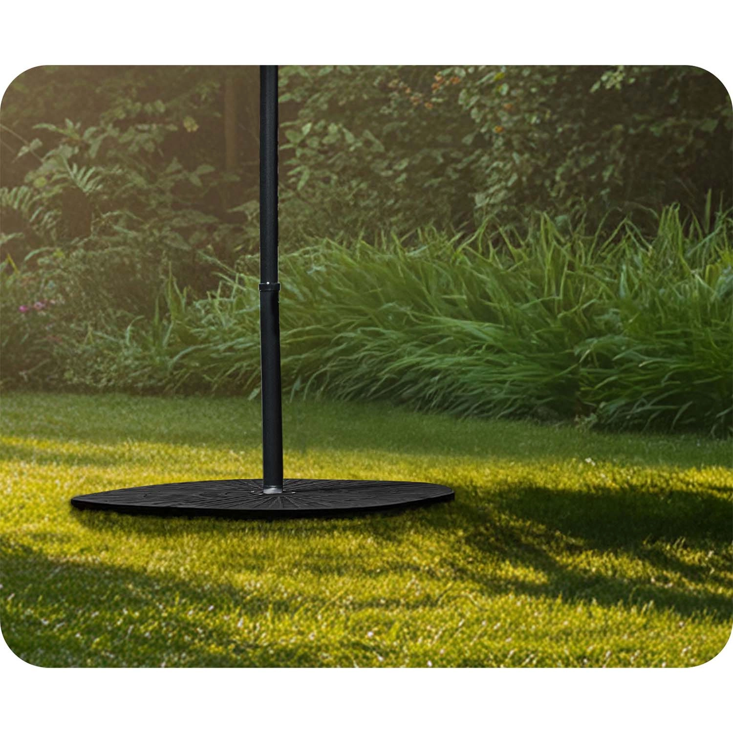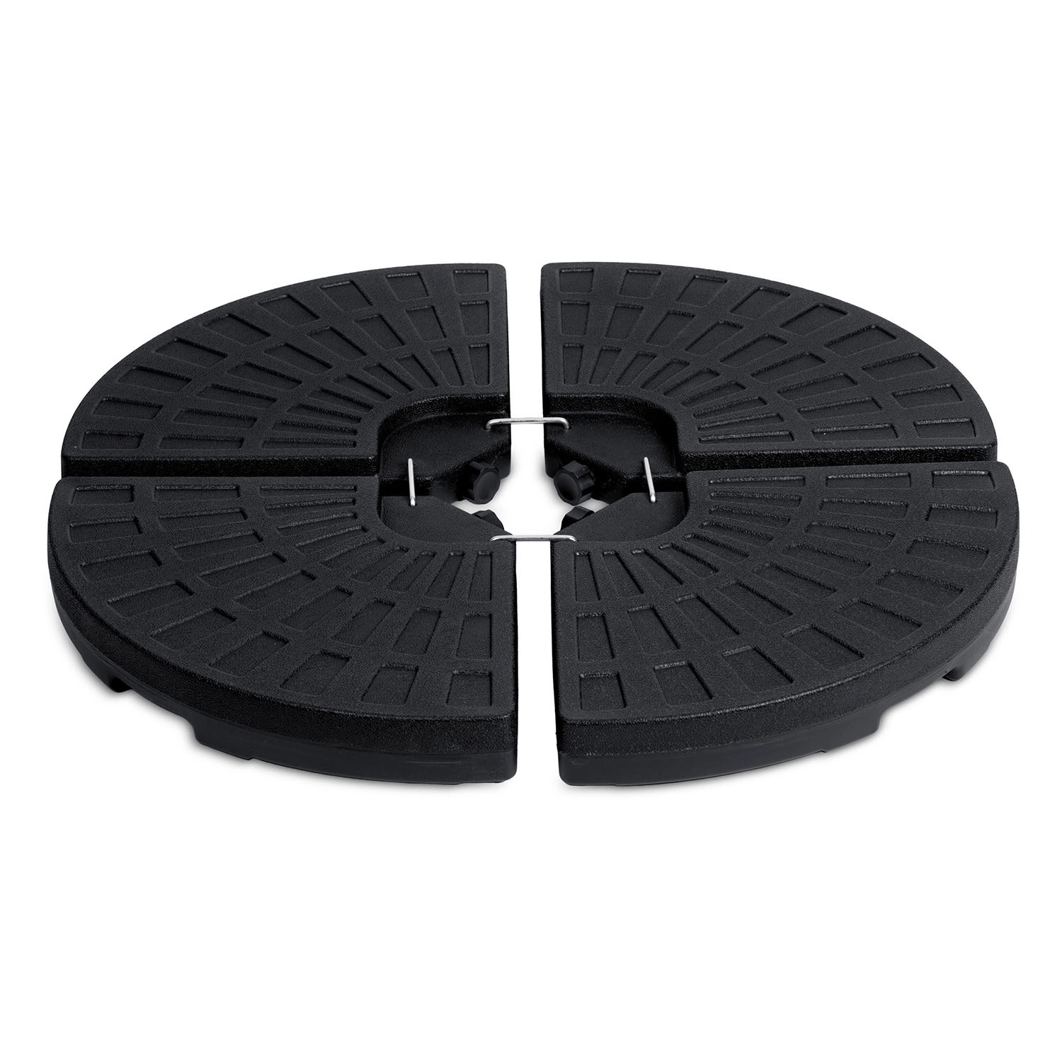 A négy egymáshoz kapcsolt szegmens szorosan körbeöleli az oszlopot, kompakt, kör alakú talpat képezve, amely szeles időben is növeli a napernyő stabilitását.