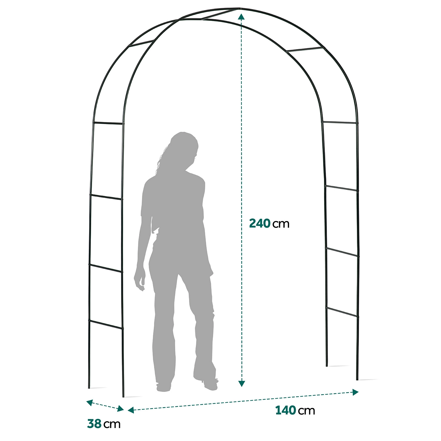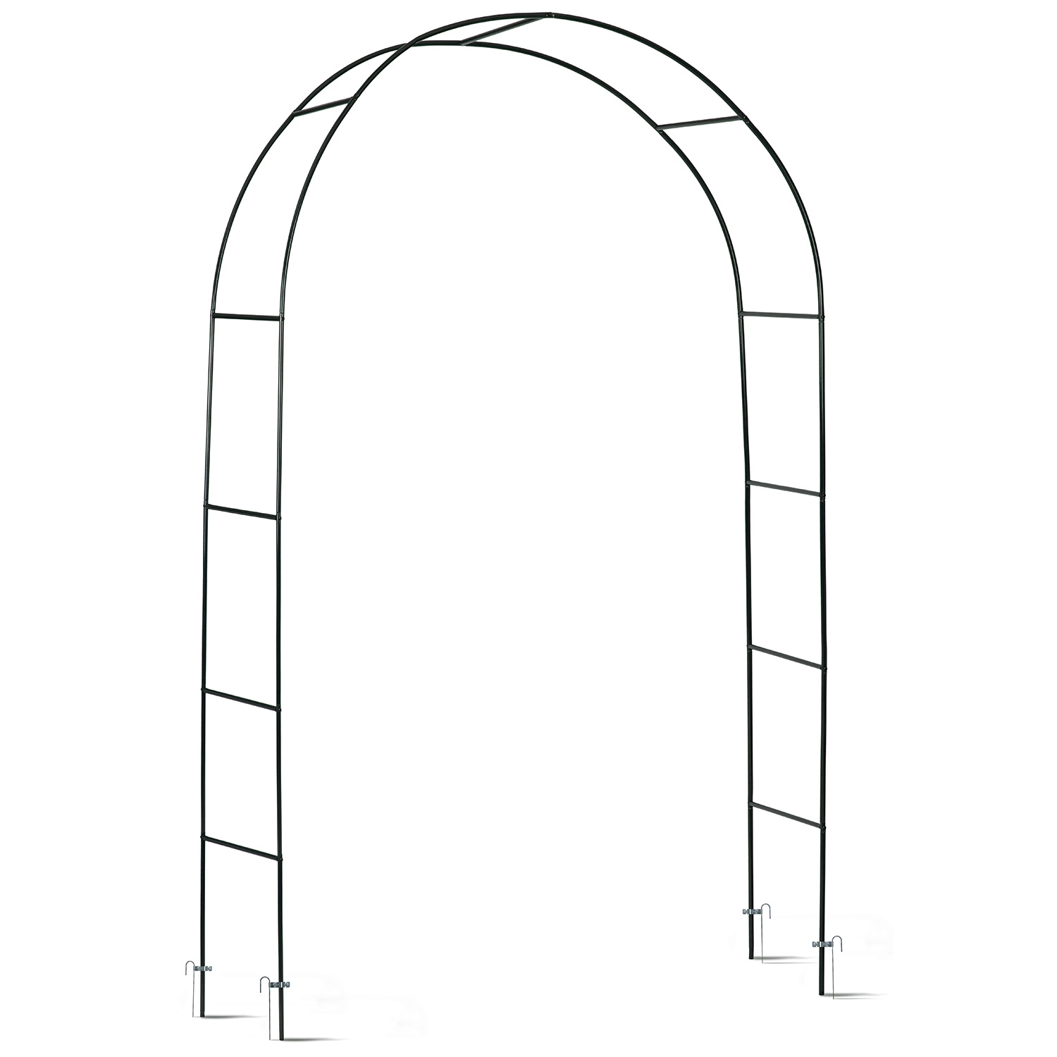 Elegáns, 240 cm magas kerti íves pergola, amely romantikus bejáratot ad a kertnek és támaszt nyújt a futónövényeknek. Tartós, porszórt acél szerkezet, egyszerű összeszerelés speciális szerszámok nélkül és talajrögzítő horgonyok a stabil rögzítéshez. Ideális rózsákhoz, borostyánhoz, szőlőhöz, valamint fényfüzérekkel való dekoráláshoz.
