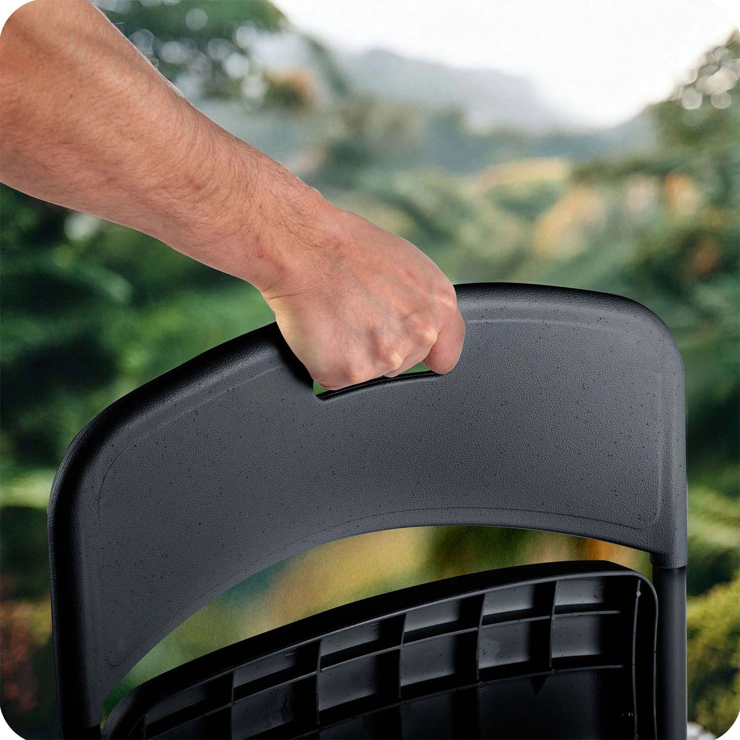 A háttámlában praktikus fogantyú található, amely megkönnyíti a kényelmes hordozást, valamint a szék gyors kinyitását és összecsukását – ideális gyakori áthelyezéshez és rendezvényekhez.