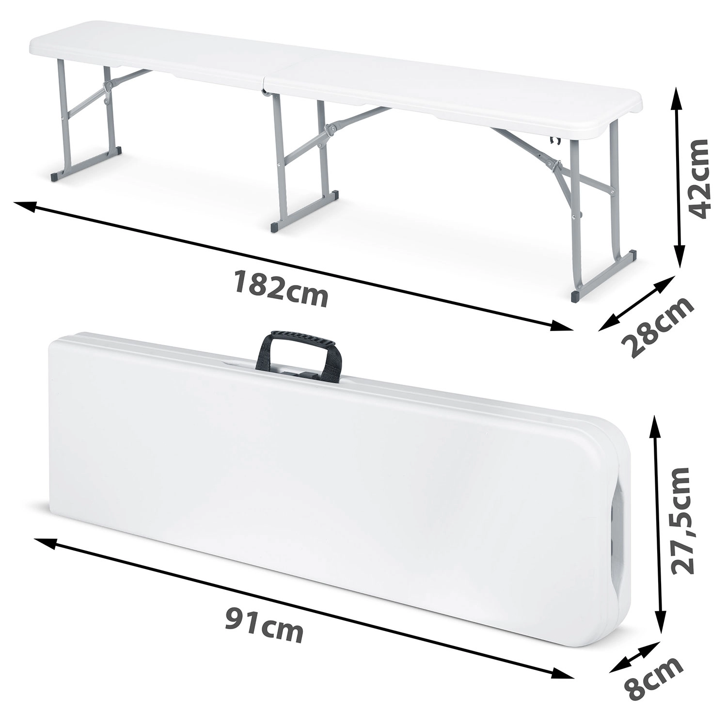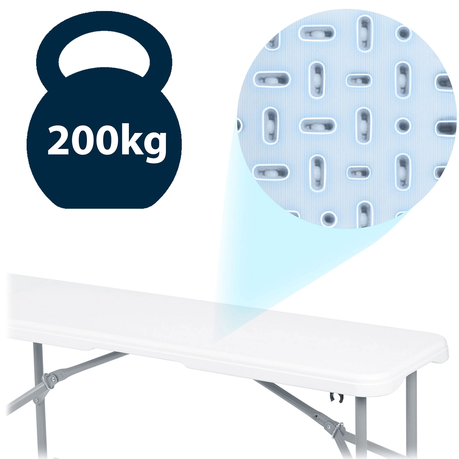 A 180 cm hosszú, praktikus összecsukható pad ideális kertbe, ünnepségekre és kempingezéshez. Erős acélvázzal, vízálló és könnyen tisztítható felülettel, valamint kényelmes hordfogantyúval rendelkezik. Összecsukva kompakt méretű, így könnyen tárolható és szállítható, mégis akár 200 kg teherbírást és megbízható stabilitást kínál.