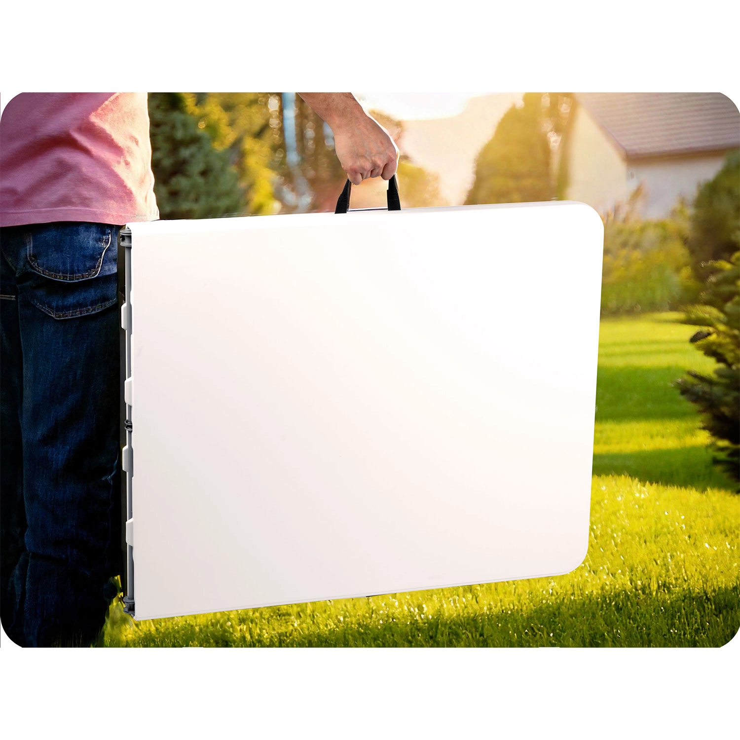Az asztal félbe hajtható, lapos, praktikus fogantyús kofferré. Ideális a gyors áthelyezéshez a kert, a terasz vagy egy esemény helyszíne között, és helytakarékos tárolást biztosít.