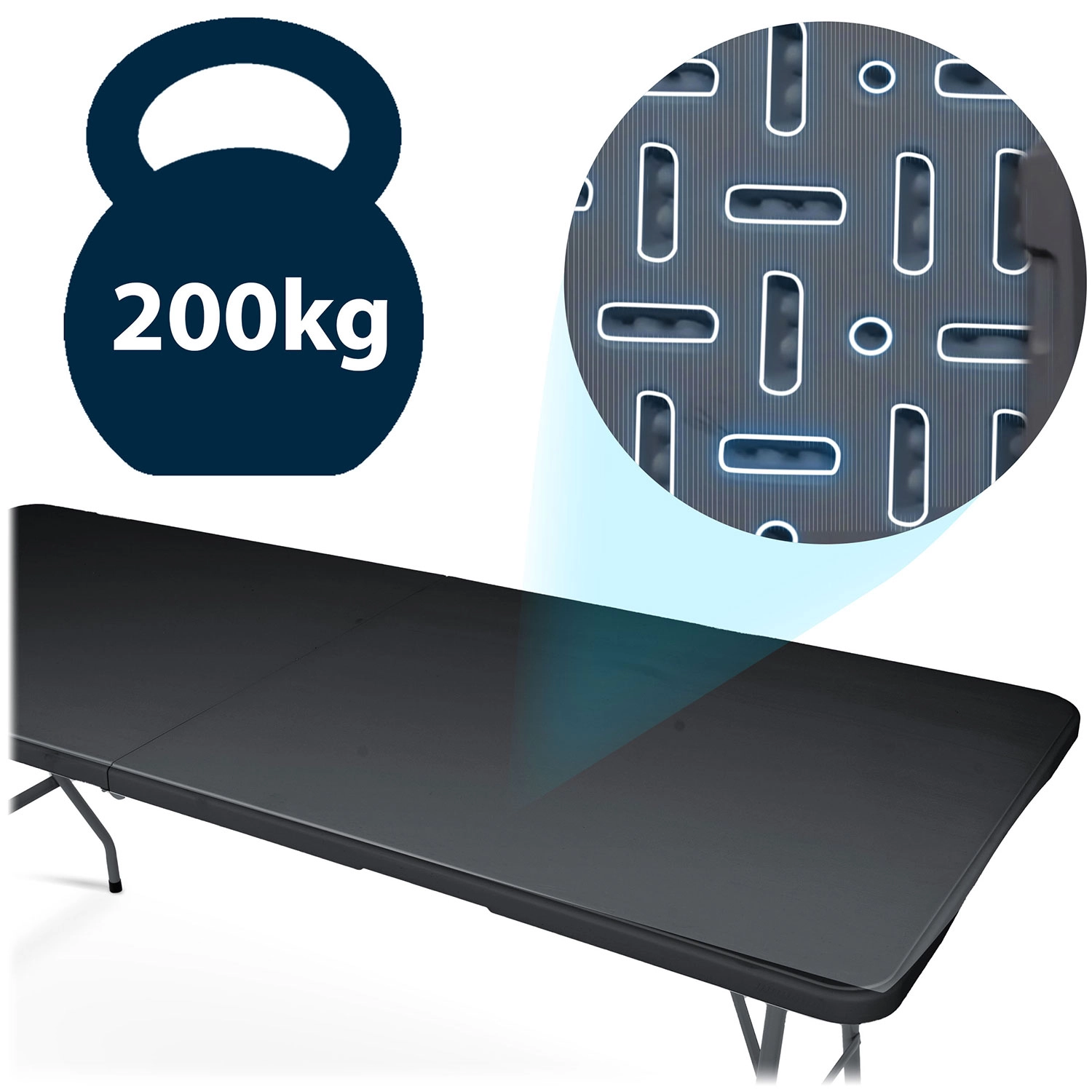 A praktikus és tartós, 180 cm hosszú összecsukható asztal ideális kerti partikra, esküvőkre, elsőáldozásokra és céges rendezvényekre. Masszív, porszórt acél vázat, vízálló, könnyen tisztítható PE asztallapot és kényelmes hordozást az integrált fogantyúval kínál. Összecsukva minimális helyet foglal, stabil, könnyű és azonnal használatra kész.