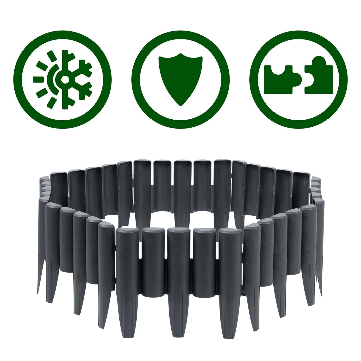 A polipropilén (PP) anyag hosszú élettartamot és ellenállást garantál a nappal szemben, fagyban és esőben is. A szegély hatékonyan választja el a gyepet a mulcstól, kavicstól vagy talajtól, segít rendet tartani, megakadályozza a fű átnövését az ágyásokba, és védi a növényeket a fűnyíró beavatkozásától.