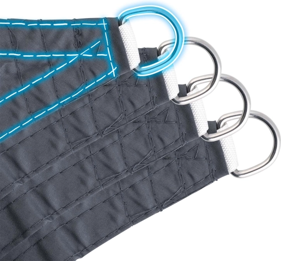 A ponyva hosszú élettartamra készült: körben dupla varrásokkal, megerősített sarkakkal és fém ringlikkel a biztonságos kifeszítéshez falak, oszlopok vagy fák között. A telepítés gyors és intuitív – elég használni a mellékelt 4 rögzítőkötél egyikeit, és szükség szerint beállítani a feszességet.