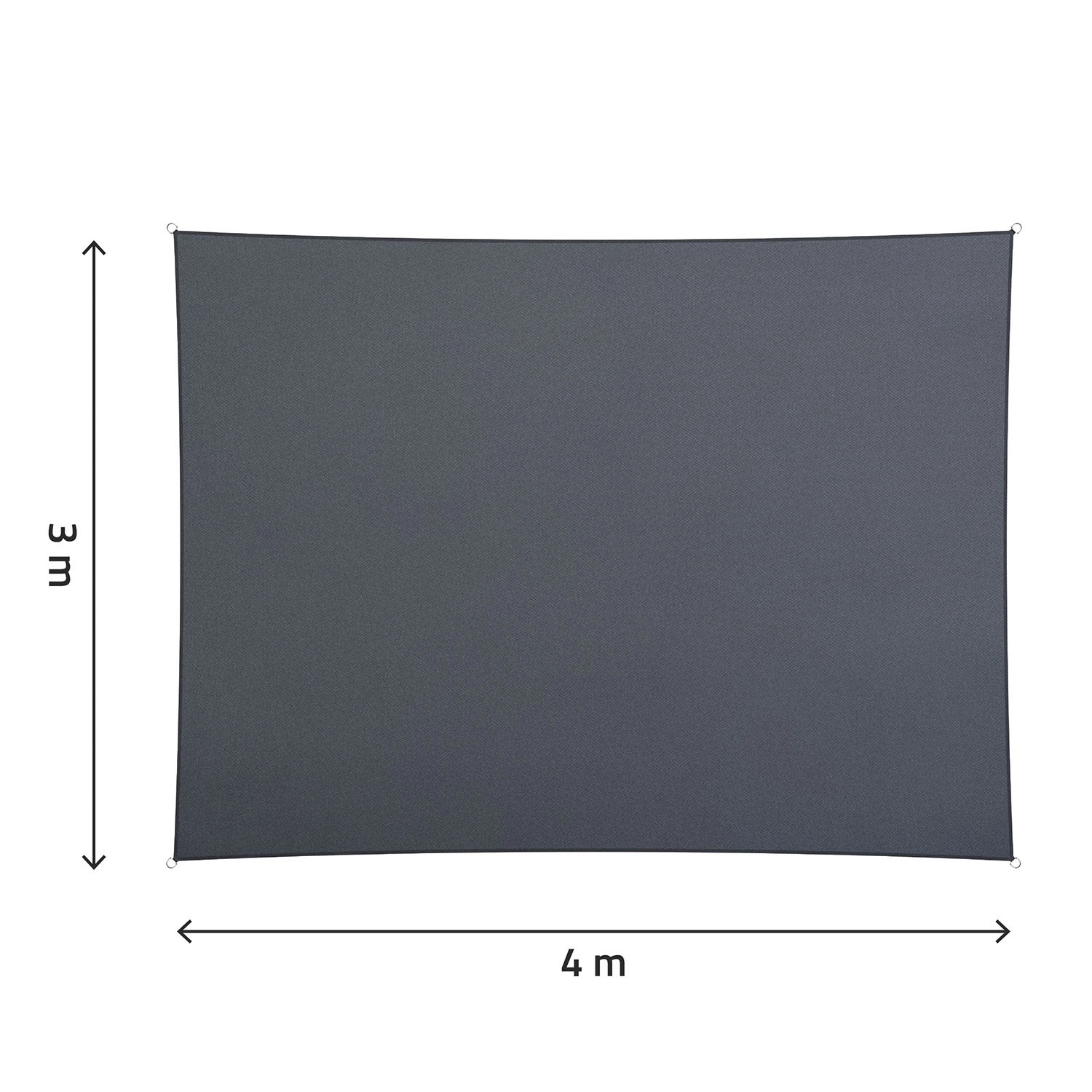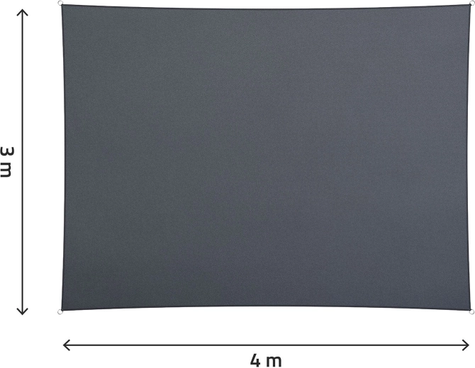 A 3 × 4 m-es, elegáns szürke téglalap alakú árnyékoló ponyva stabil és kényelmes árnyékot ad bármely kültéri felületen. A sűrű szövésű 180 g/m² PE anyag vízlepergető, és segít védelmet nyújtani a UV-sugárzás és az enyhe csapadék ellen – a vízcseppek könnyedén lefolynak a felületen.