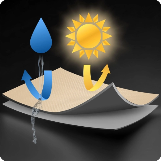 - Vízlepergető PE 180 g/m² – UV-védelem és védelem enyhe eső ellen.