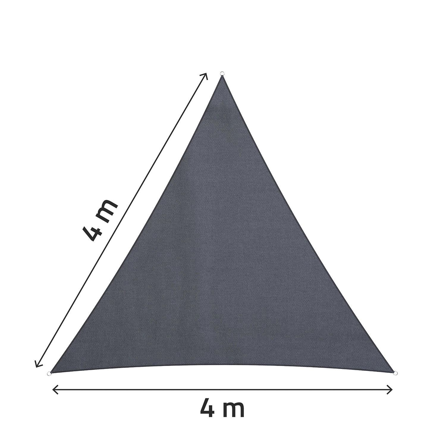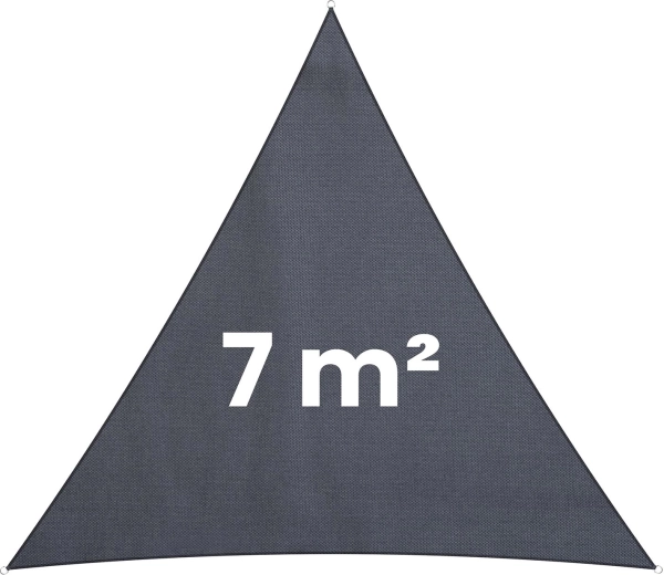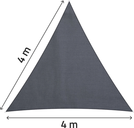 Ez a szürke, háromszög alakú napvitorla 400 × 400 × 400 cm-es oldalakkal ott nyújt nagy árnyékfelületet, ahol épp szükség van rá. A 180 g/m² sűrű szövésű polietilén (PE) időjárásálló, kevesebb napfényt enged át, és véd az enyhe záporoktól – a cseppek könnyen leperegnek a felületen.