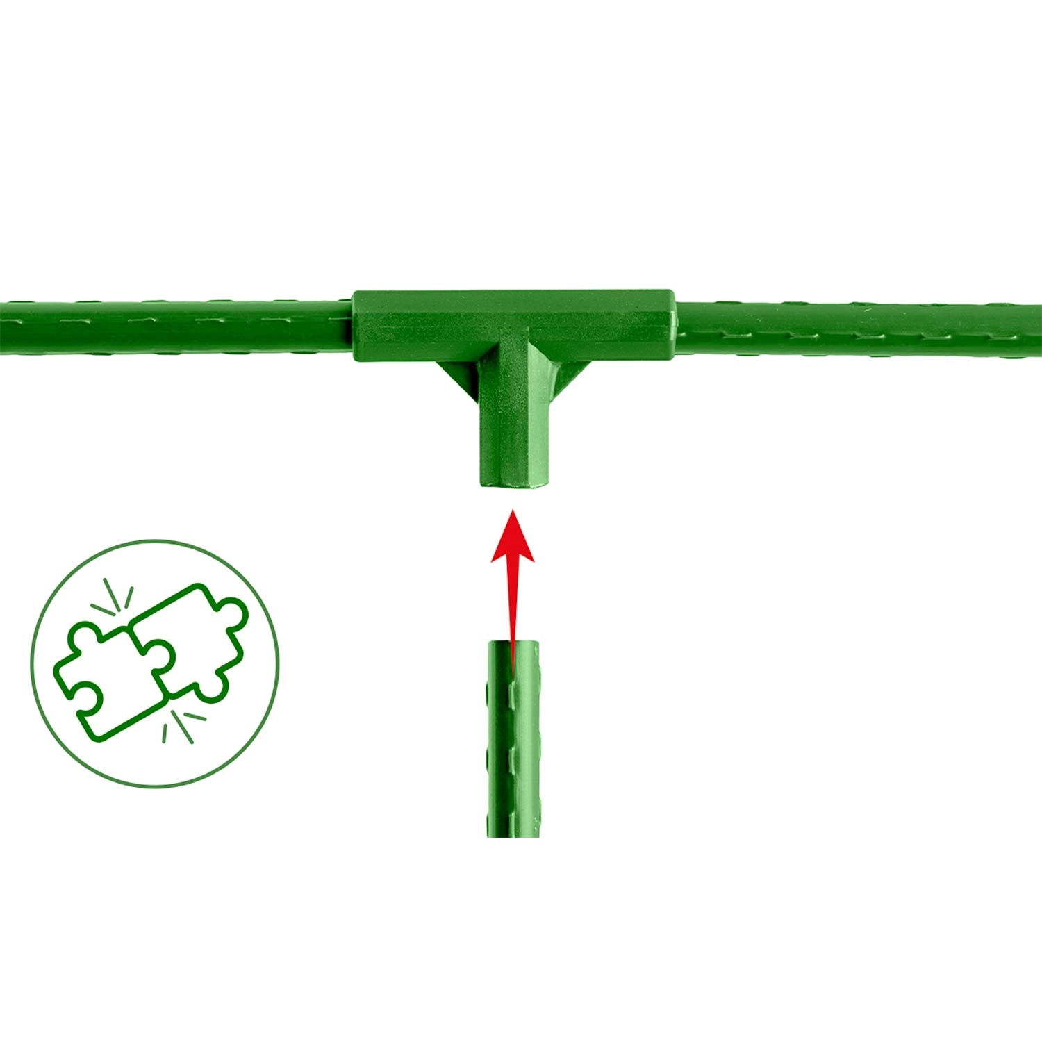 Praktikus T-idomok 11 mm átmérőjű kerti rudakhoz, amelyekkel gyorsan építhet stabil tartószerkezeteket paradicsomhoz és más kúszónövényekhez. A moduláris rendszernek köszönhetően könnyedén hozhat létre stabil támaszokat, rácsokat, sátrakat és alagutakat pontosan az igények szerint. A tartós PE műanyag hosszú élettartamot biztosít, és a kötés terhelés alatt is szilárdan tart.