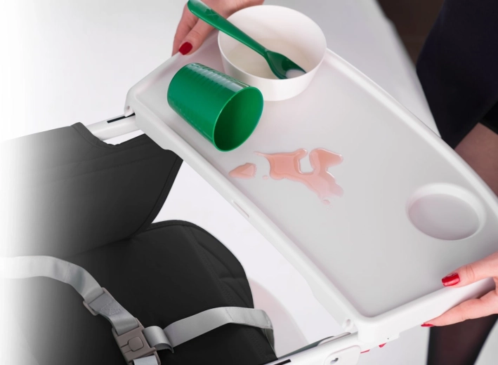 Az etetőszék néhány másodperc alatt helytakarékos méretre csukható – kisebb lakásokba és utazáshoz ideális. Összecsukva minimális helyet foglal.