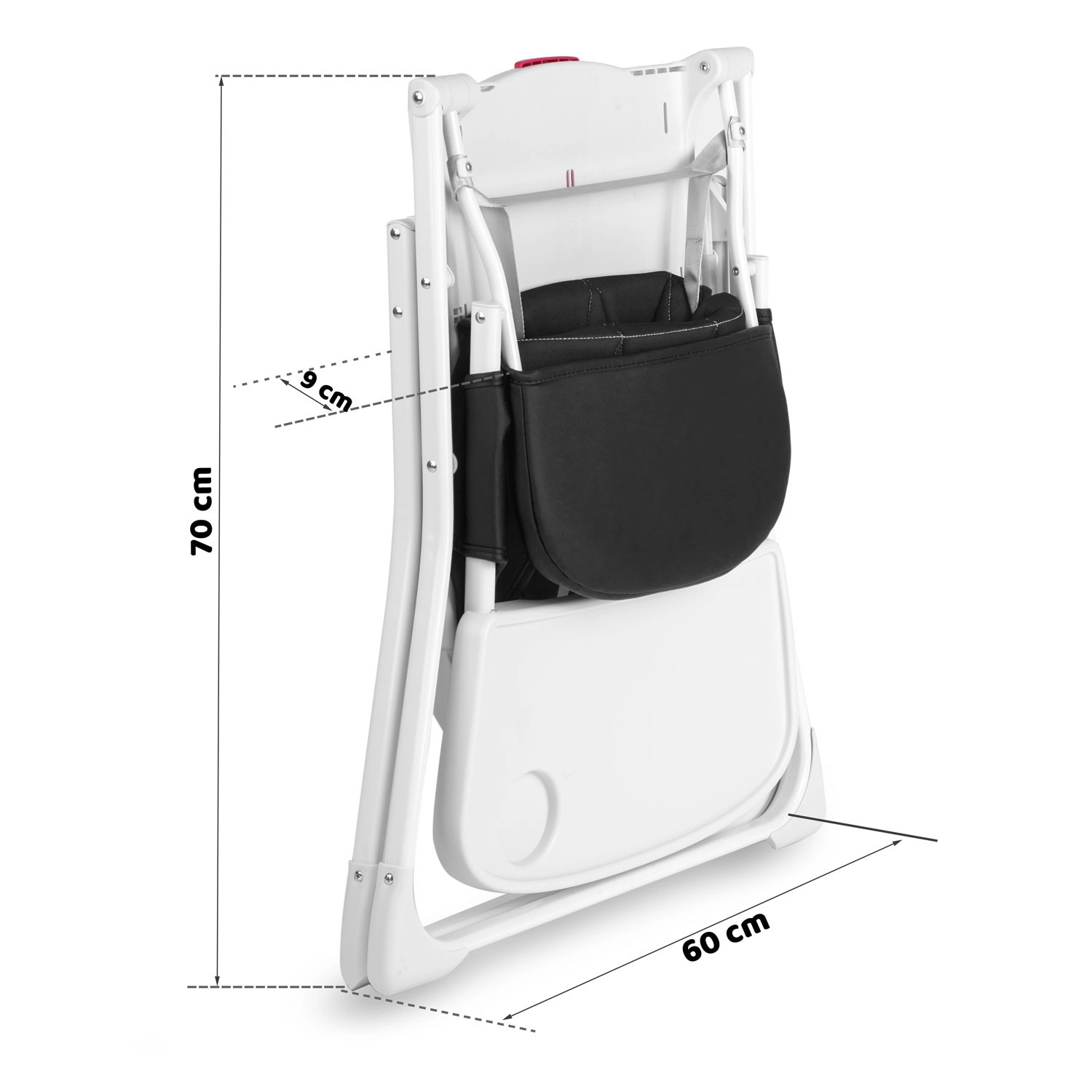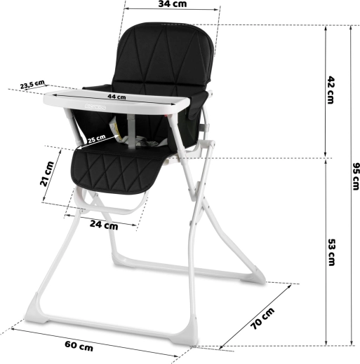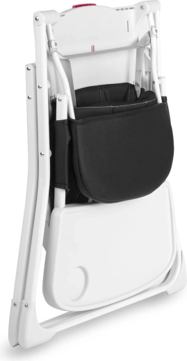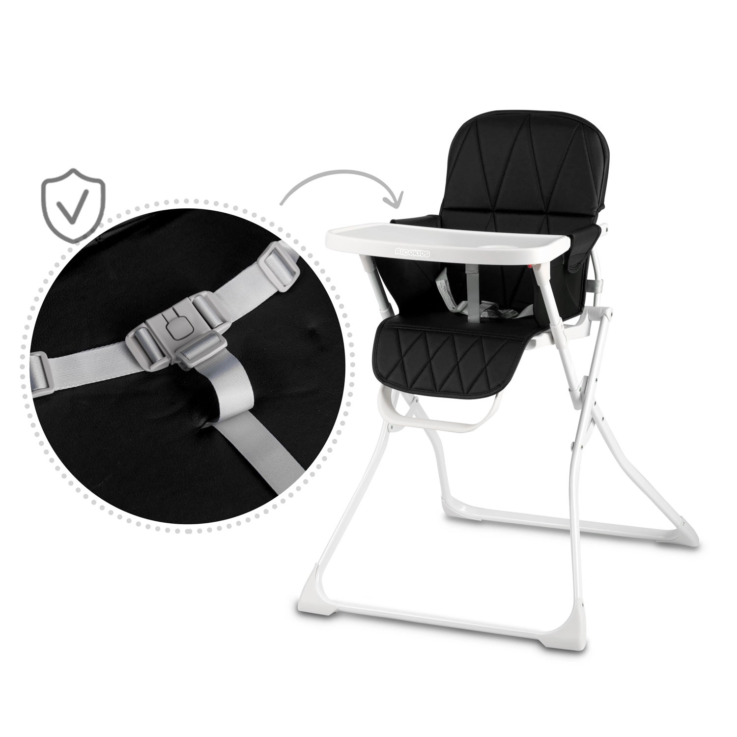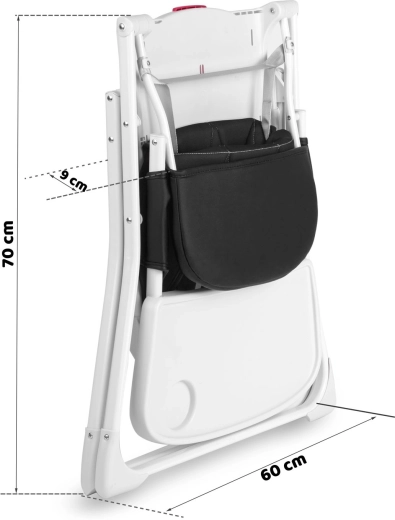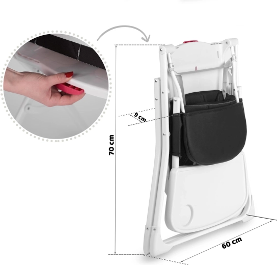 A gyors, egygombos összecsukásnak köszönhetően az etetőszéket pillanatok alatt elteheti a szekrénybe vagy a sarokba. Az állítható hosszúságú, 3 pontos övek stabil és biztonságos pozícióban tartják a gyermeket, míg a lábtartó támogatja a helyes ülést és a kényelmet étkezés és játék közben is.