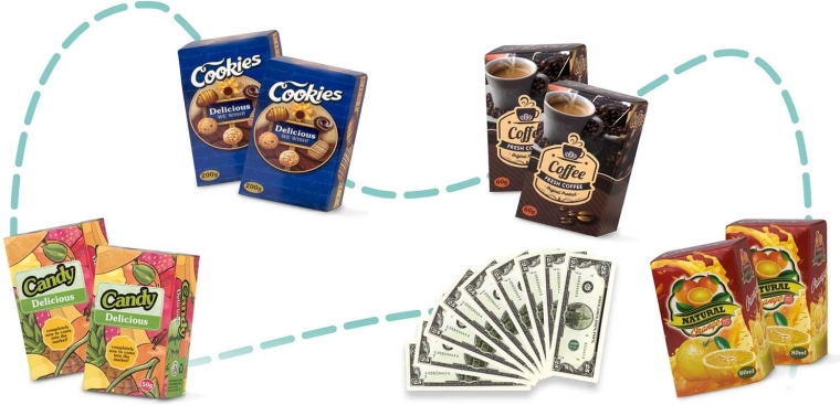 A csomag tartalmaz műanyag élelmiszereket (gyümölcsök, zöldségek, tojások), 8 dobozt és 9 bankjegyet a valósághű boltos játékhoz és az élelmiszerek megismeréséhez.