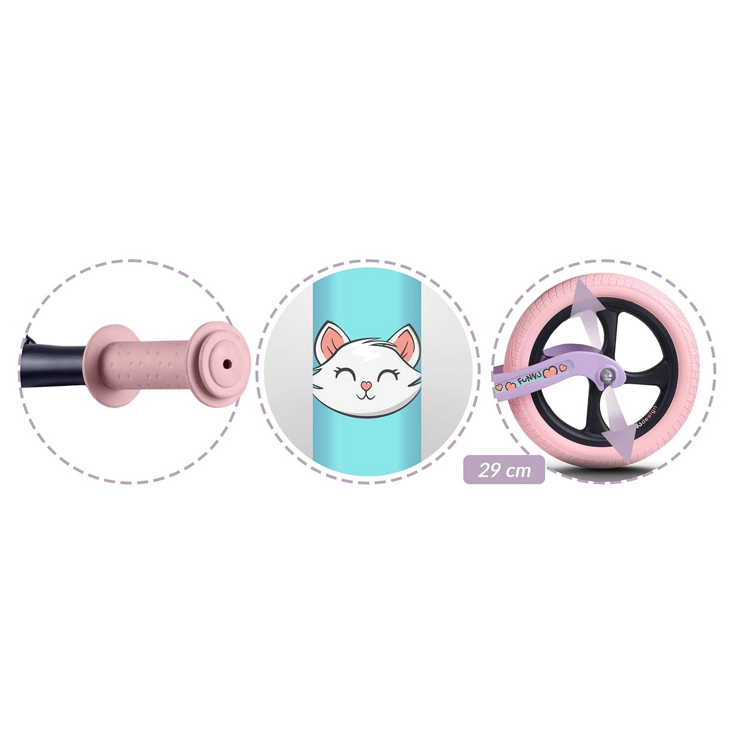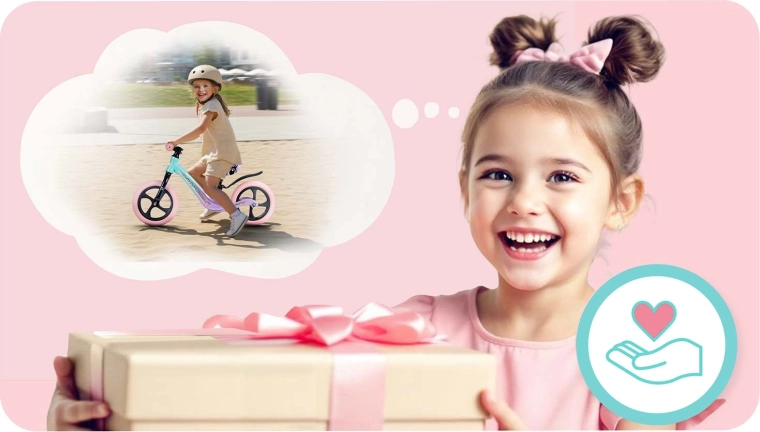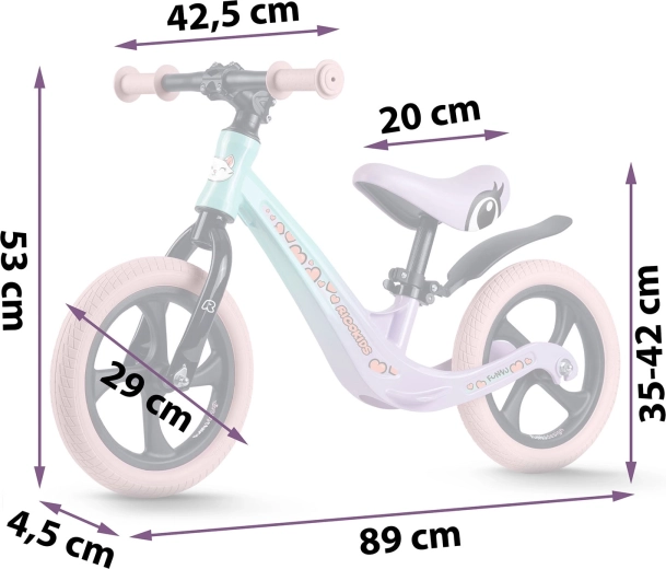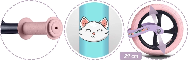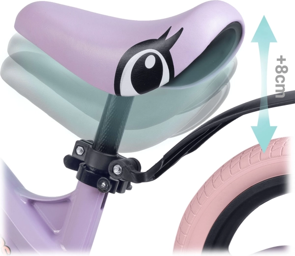 Az ergonomikus, puha habszivacs nyereg fokozatmentes magasságállítással (kb. 35–42 cm) együtt nő a gyerekkel, és kényelmet biztosít minden úton. Az ütközőperemes gumimarkolatok biztos fogást és irányítást adnak, míg a széles kormány és a stabil tengelytáv támogatja az egyensúly természetes elsajátítását.