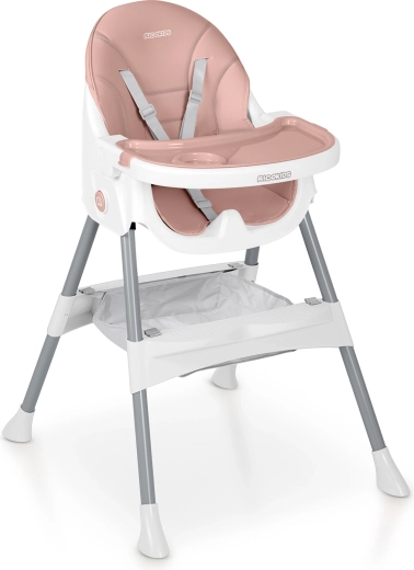 A praktikus Ricokids Mani gyermek etetőszék rózsaszín színben ötvözi az biztonságot, a könnyű tisztíthatóságot és a kényelmet étkezéshez és játékhoz egyaránt. Állítható és levehető tálcát kínál megemelt peremekkel, 5 pontos biztonsági övet, stabil lábakat csúszásgátló végekkel, valamint tárolópolcot/kosarat játékoknak és kellékeknek. Ideális 6 hónapos kortól 15 kg-ig.
