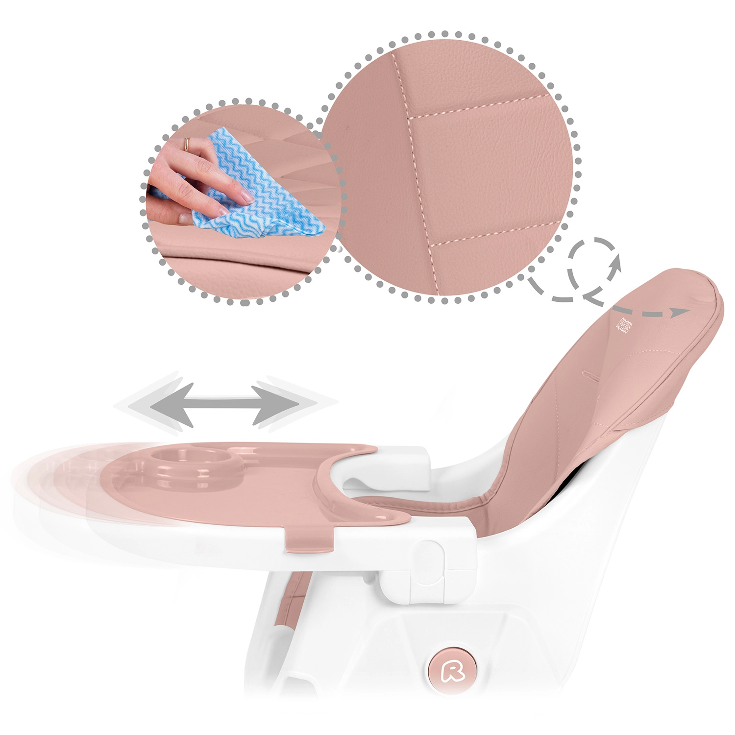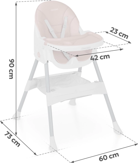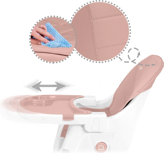 A karbantartás gyerekjáték: a tálca kivehető betéttel folyó víz alatt elöblíthető vagy mosogatógépbe tehető, a foltot nem beszívó felületű huzatok pedig egyszerűen, nedves ruhával tisztíthatók. A stabil acéllábak csúszásgátló végekkel és az 5 pontos öv, amely megfelel az EN 14988 szabványnak, maximális biztonságot nyújtanak.