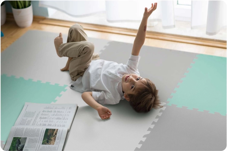 A vastag, 1 cm-es EVA hab hatékonyan tompítja az ütéseket, véd a hideg padlótól, és kényelmes helyet teremt játékhoz és tornához.
