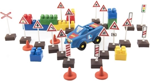 Trafik Iskola Építőjáték szórakozást és tanulást kínál egyben! Tartalmaz 16 darab közlekedési táblát, 2 bóját és egy autót, ami ideális a gyermekek készségeinek fejlesztésére.