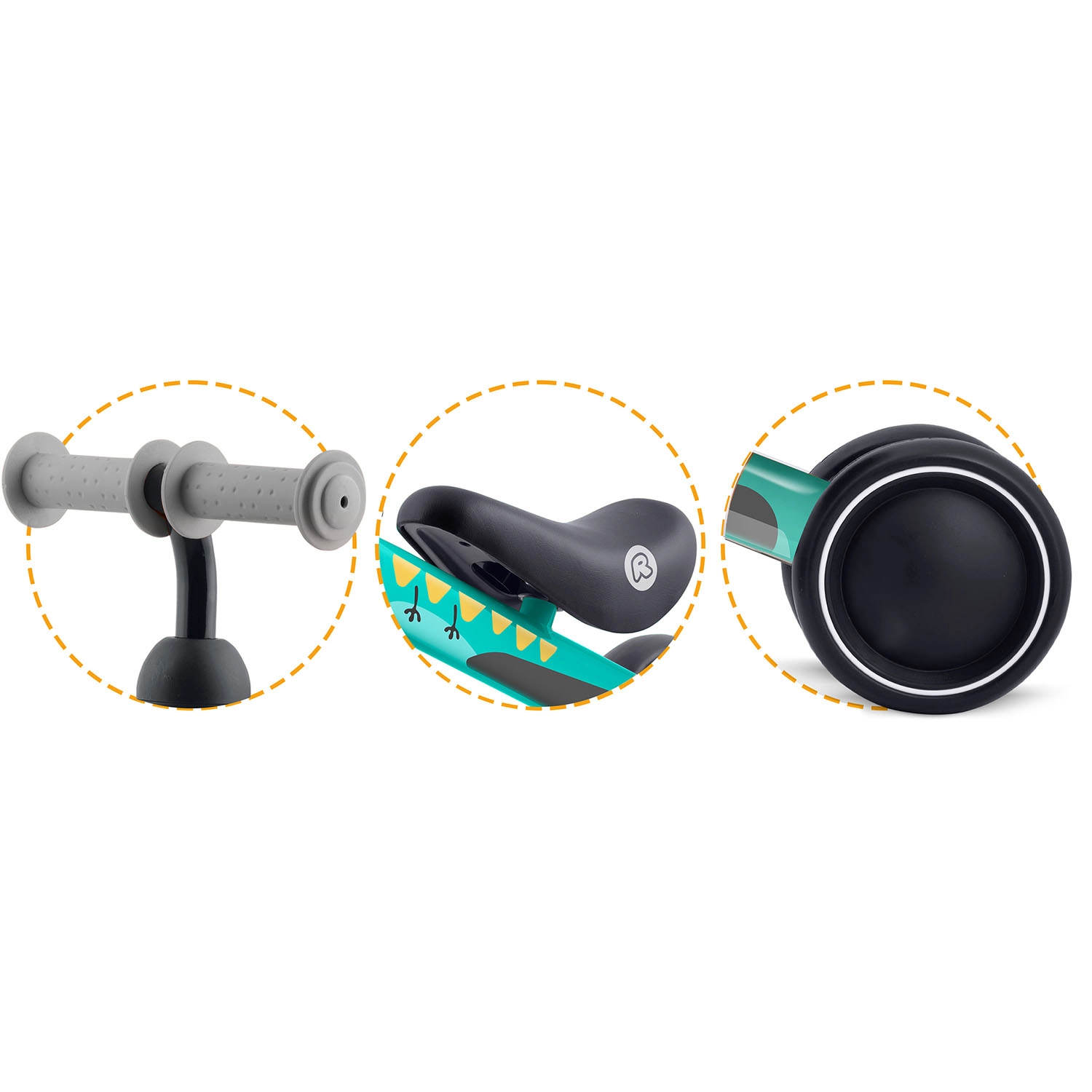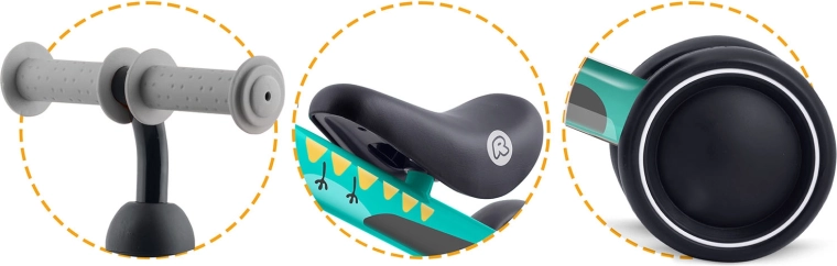 A maximális biztonság érdekében a kormányzás korlátozott elfordulási szöggel rendelkezik, amely megelőzi a hirtelen túltekerést és így az eséseket. A széles műanyag kerekek csendes futása megkönnyíti a stabilitás megőrzését, így a gyerekek a mozgáskoordináció és az egyensúly fejlesztésére koncentrálhatnak.