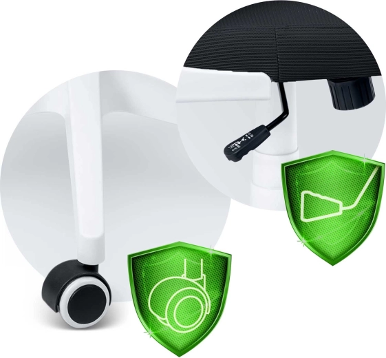A nejlon–gumírozott, dupla kerekek egyenletesen és halkan gurulnak, és kímélik a padlót. Az ötágú talp stabilitást és biztonságot nyújt.