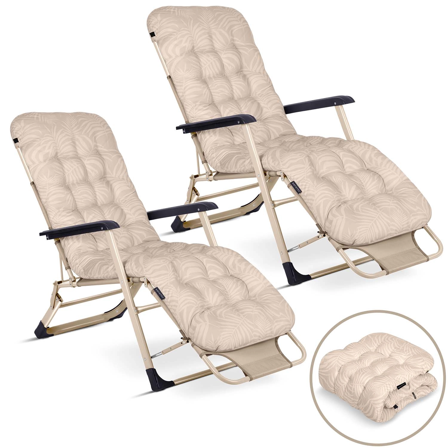 A robusztus váz 120 kg teherbírással stabil, UV-álló és bírja a hőmérséklet-ingadozásokat. A strapabíró műanyag kartámaszok növelik a komfortot, a lábakon lévő csúszásgátló végek pedig különböző felületeken is biztos tartást adnak. Összecsukva a nyugágyak minimális helyet foglalnak, és könnyen beférnek az autó csomagtartójába – ideálisak nyaraláshoz, medence mellé vagy a strandra.