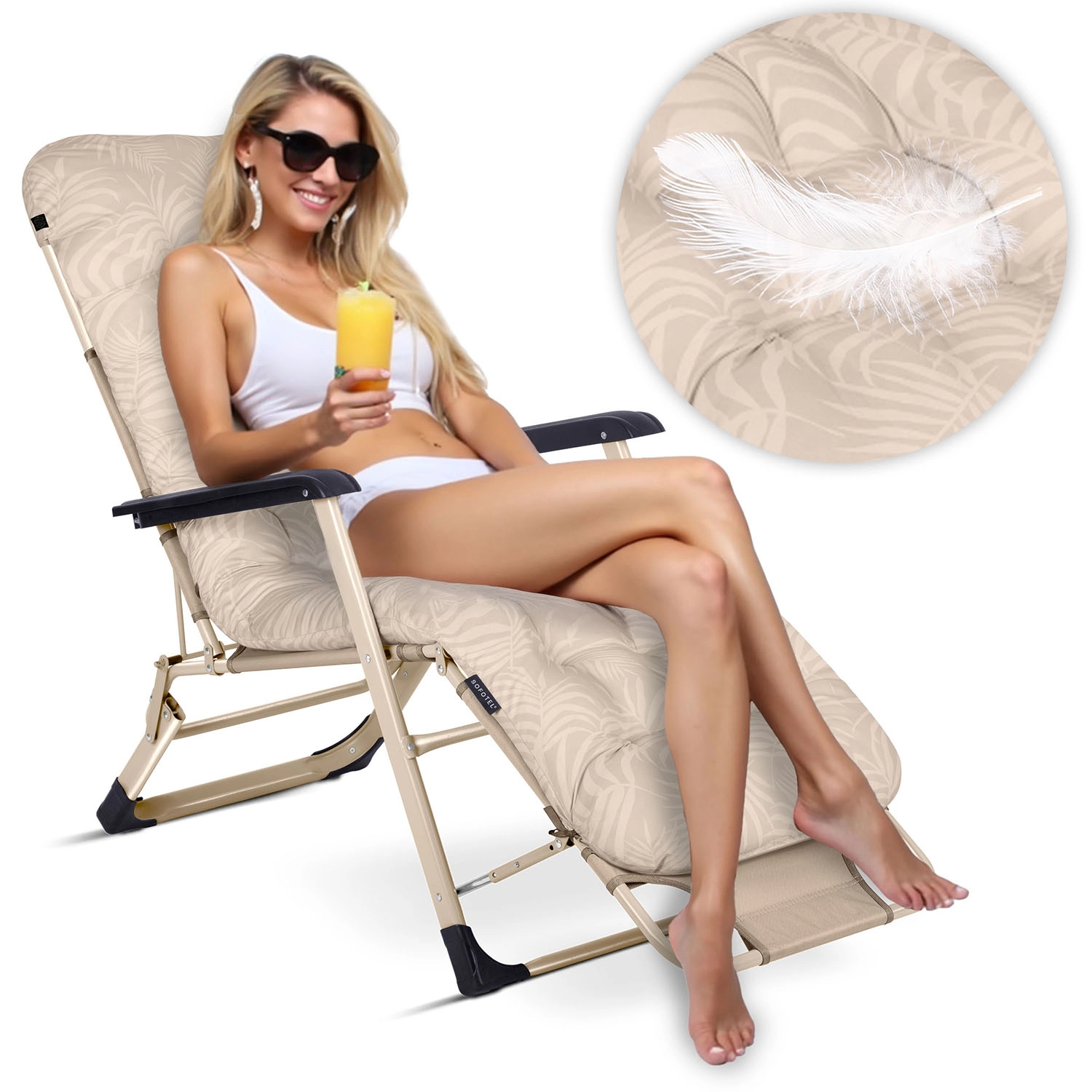 A vastagon töltött, steppelt párna és az állítható fejpárna lágy tartást biztosít az egész napos relaxáláshoz a kertben vagy a medence mellett.