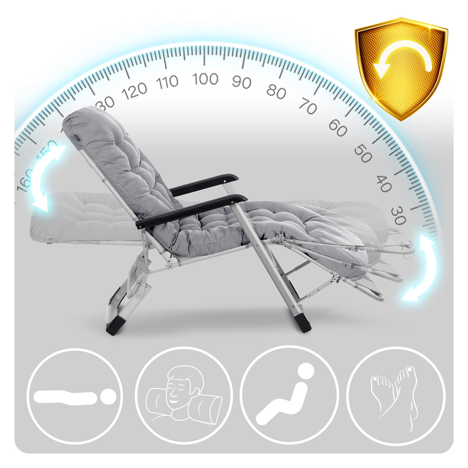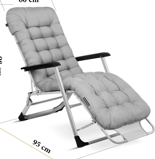 Könnyű fémváz műanyag karfákkal, UV-álló Texline huzattal és csúszásgátló végekkel. Könnyen összecsukható és hordozható.