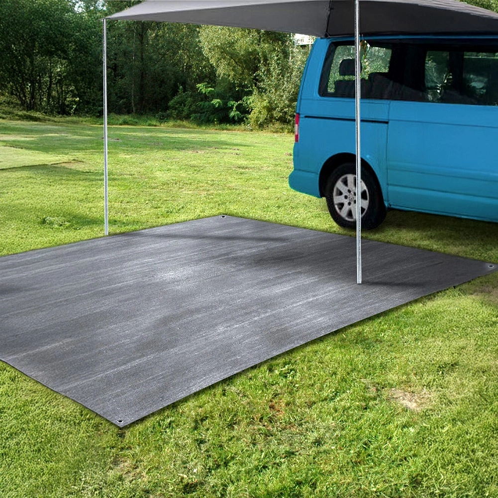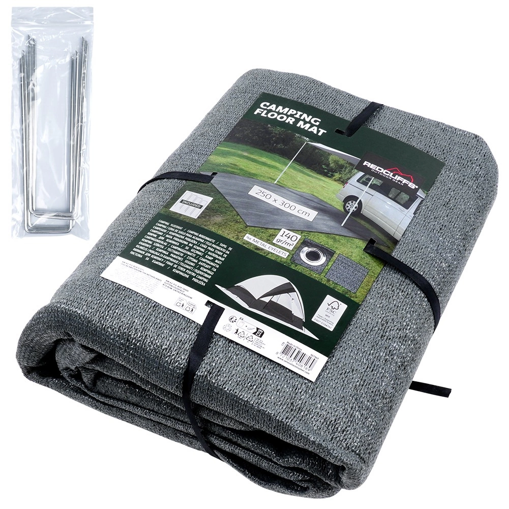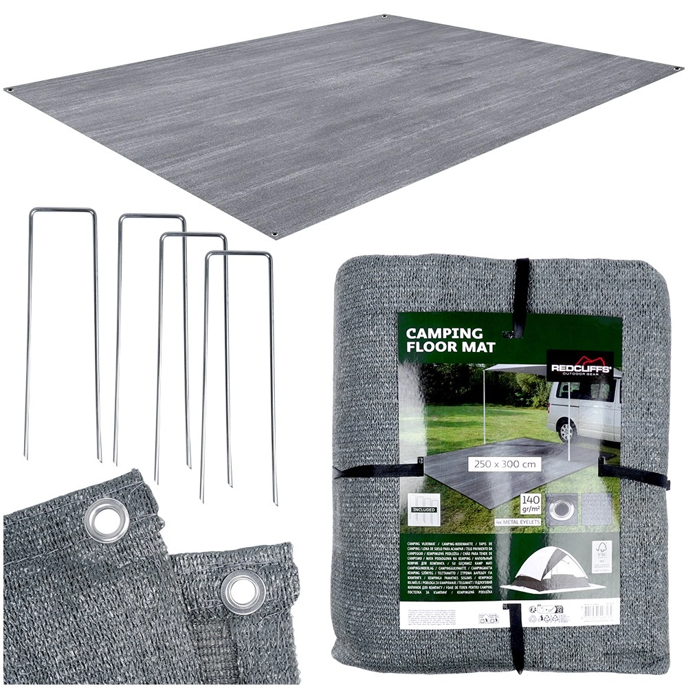 Praktikus sátor- és előtéralátét 250 × 300 cm méretben, amely kempingezéskor biztosítja a tisztaságot, szárazságot és magasabb kényelmet. Tartós, könnyen tisztítható hálós szövetből készült szürke színben, fém ringlikkel a rögzítéshez, a csomagban pedig 4 cövek is található a stabil rögzítéshez. Alkalmas lakóautó előtetője alá, pavilonba, strandra vagy piknikhez is.