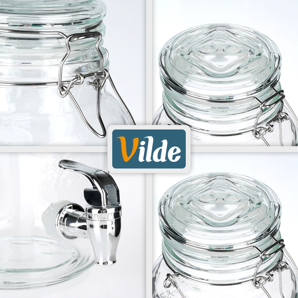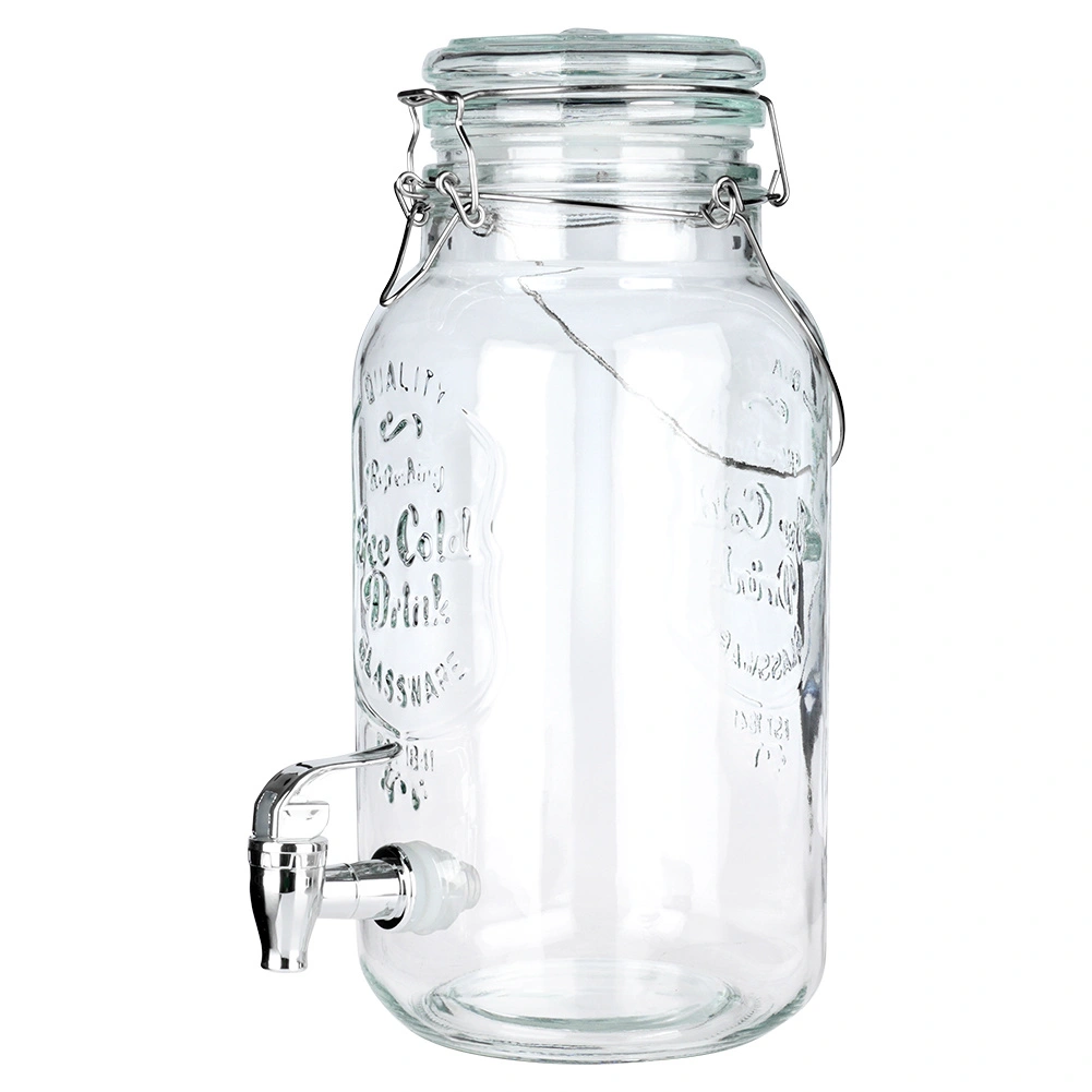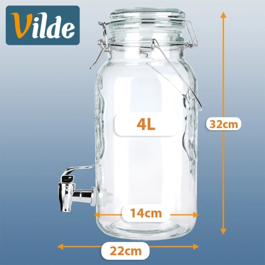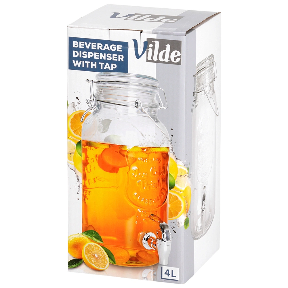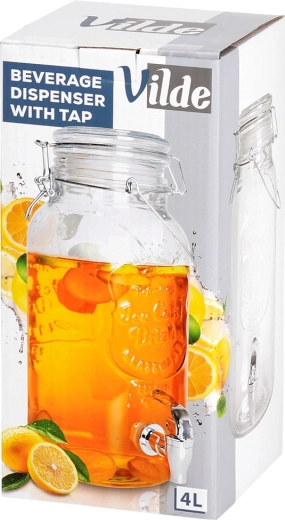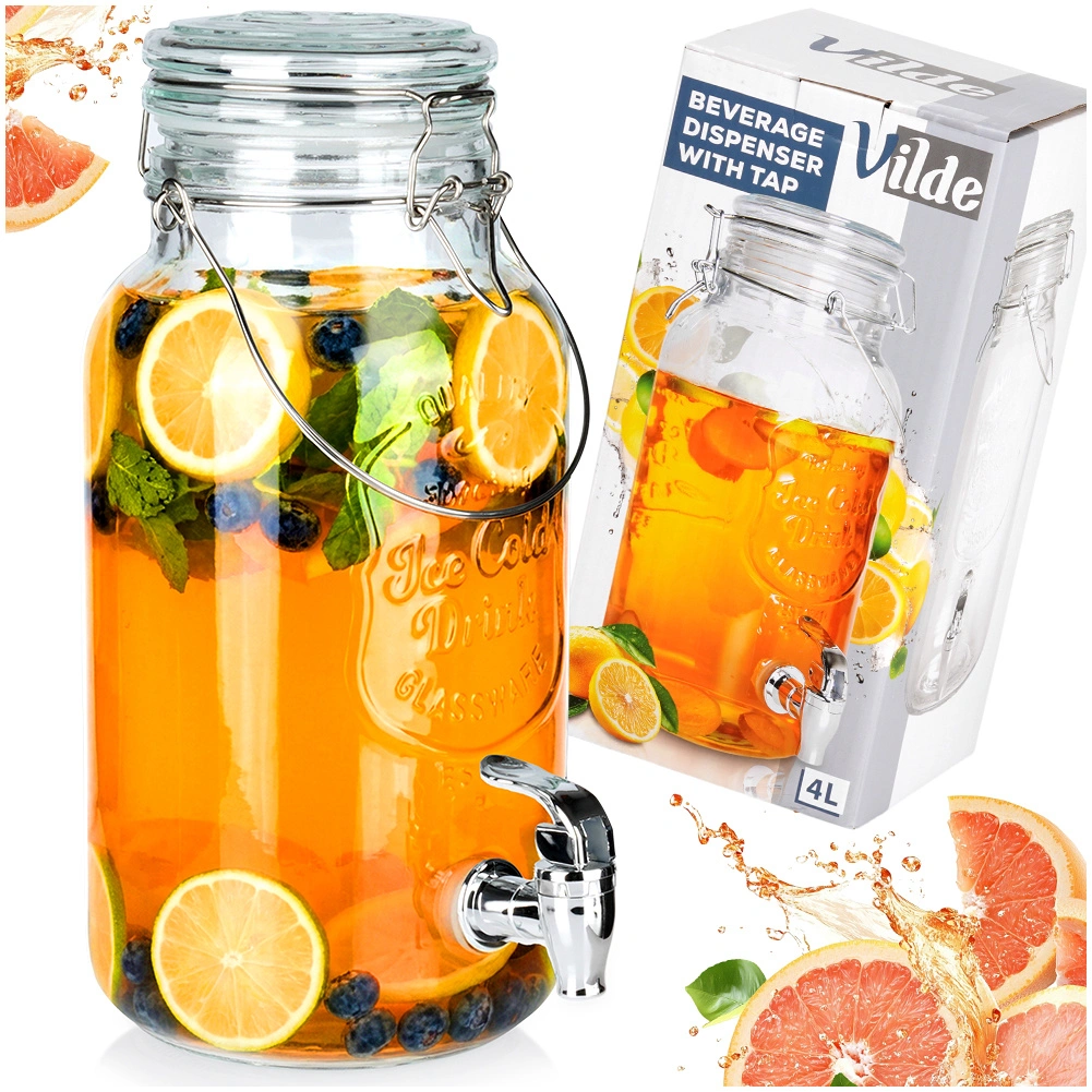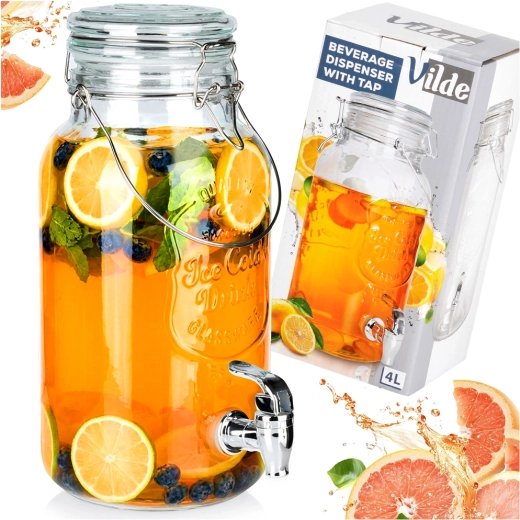 Stílusos, 4 literes üveg adagoló fém csappal és légmentesen záródó fedéllel, ideális limonádé, gyümölcsös víz, puncs vagy jeges tea tálalásához. A széles nyaknak köszönhetően könnyen tölthető és tisztítható, az erős fogantyú megkönnyíti a szállítást, a klipszes zárás pedig megvédi az italt a rovaroktól.