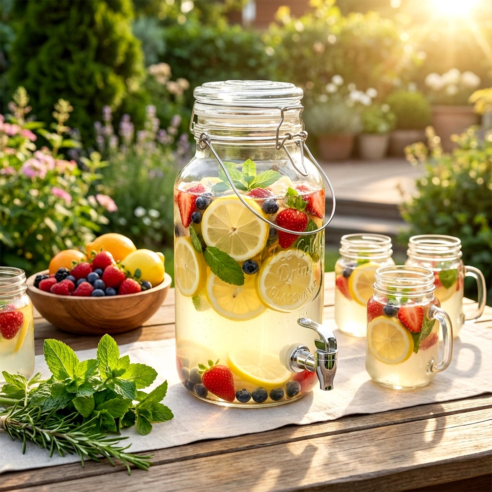 A 4 literes, tiszta, vastag üveg szépen kiemeli a gyümölcsöket, a fűszernövényeket és a jégkockákat – tökéletes limonádékhoz és infúziós vizekhez bármilyen eseményen.