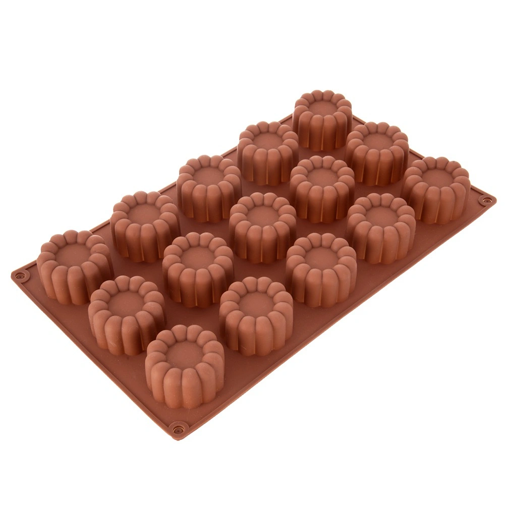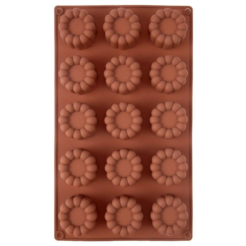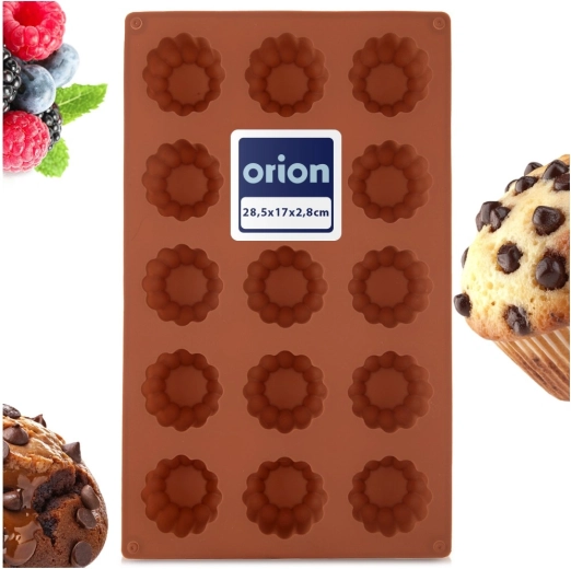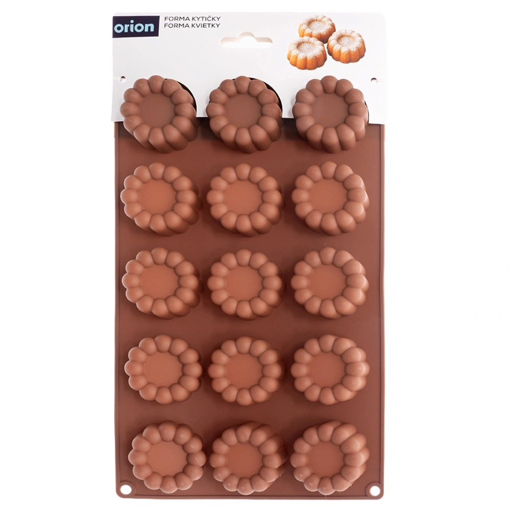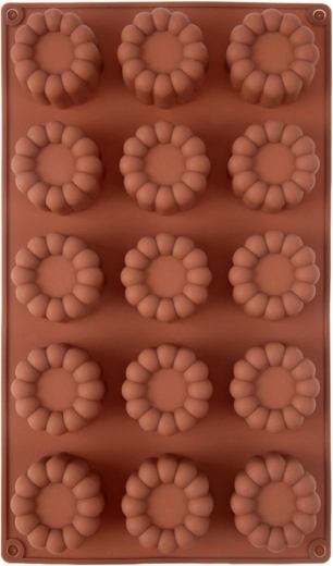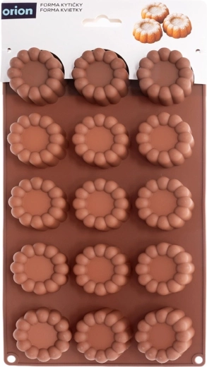 Ez a barna szilikon forma ideális a házi édességek gyors és kreatív elkészítéséhez. A 15 virág alakú mélyedésnek köszönhetően egységes és dekoratív eredményt érhet el mini kuglófok, kekszek, csokoládék és pralinék sütésekor. A szilikon anyag rugalmas és tapadásmentes, így a kész finomságok könnyen kivehetők törés nélkül, zsiradékos kenés vagy lisztezés nélkül.