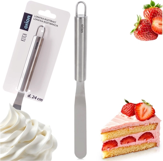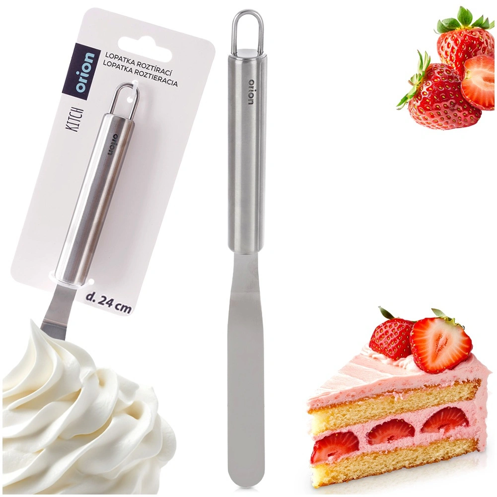 Praktikus cukrász spatula minőségi rozsdamentes acélból krémek, mázak és tejszínhab pontos elkenéséhez tortákon és aprósüteményeken. A karcsú, 2 cm-es penge és a 24 cm-es hossz révén precíz simítást, könnyű kezelhetőséget és hosszú élettartamot biztosít. Alkalmas otthoni és professzionális konyhába.
