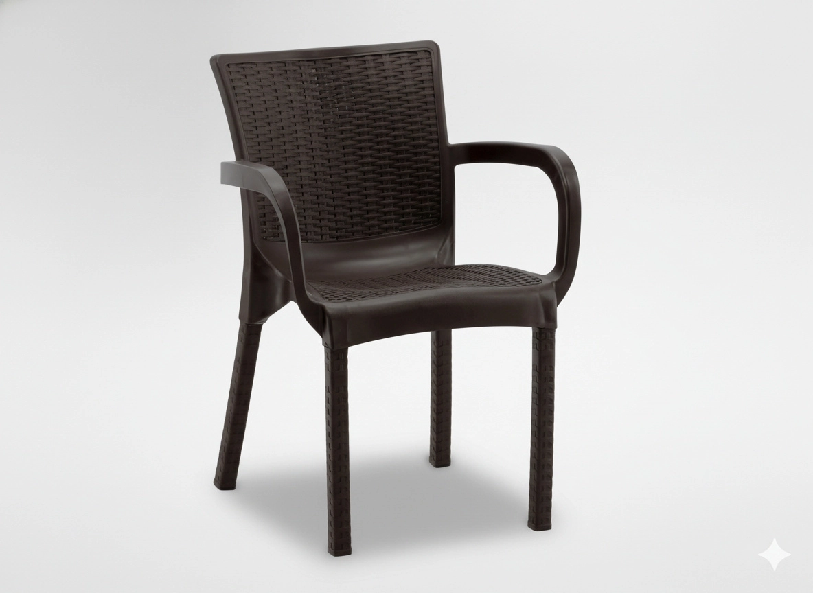 Az elegáns, barna árnyalatú fotel időtálló rattan dizájnt ötvöz a modern anyagok praktikusságával. A perforált háttámla és ülőlap szellőzést és gyors száradást biztosít, így ideális a mindennapi pihenéshez és baráti beszélgetésekhez.