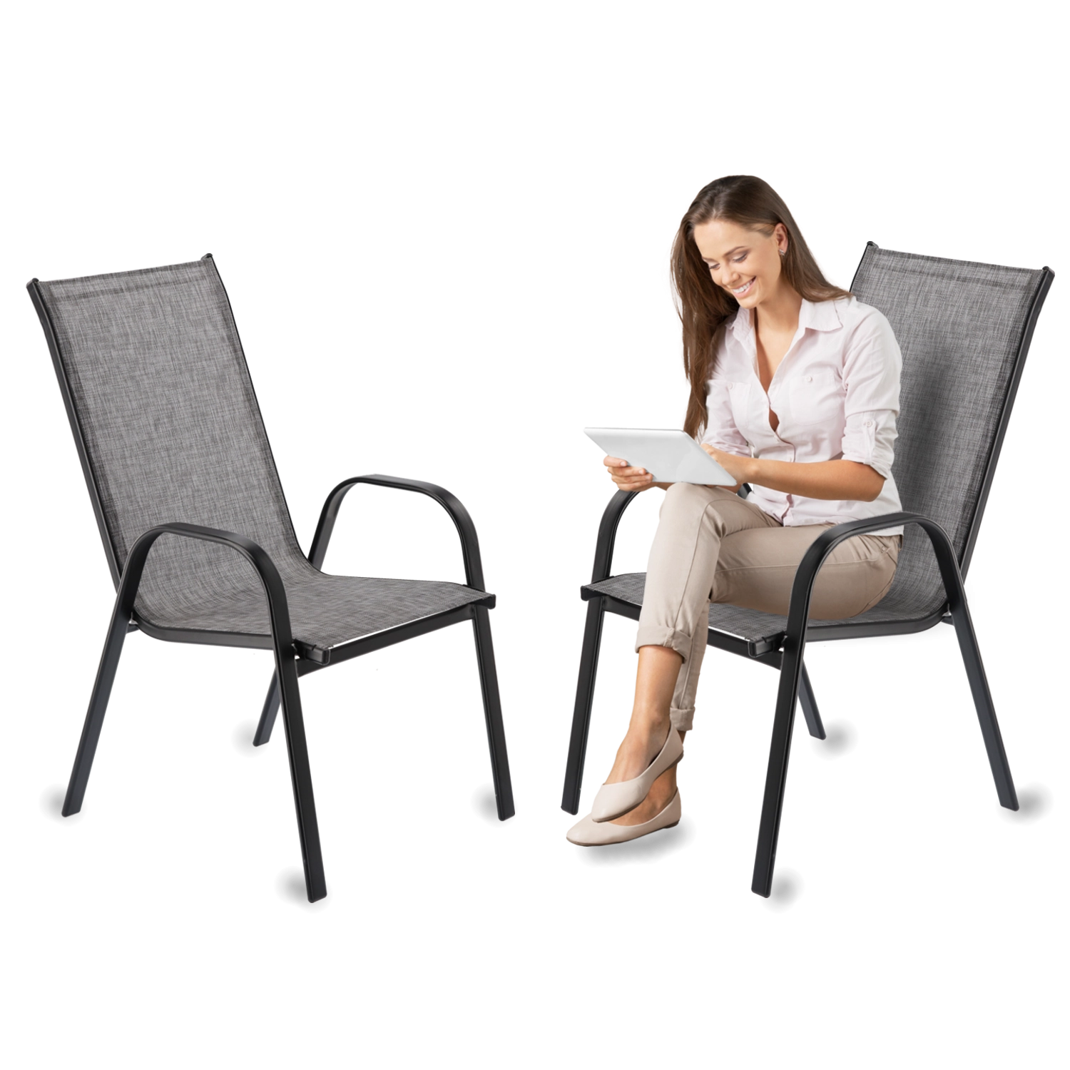 A két darabos GARDENLINE kerti fotelkészlet a klasszikus dizájnt, a modern szürke textilént és a tartós, porszórt acélvázat ötvözi. Kényelmes kartámasszal rendelkezik, stabil és könnyű, a rakásolhatóságnak köszönhetően pedig szezonon kívül is egyszerűen tárolható. Ideális teraszra, erkélyre és kertbe.