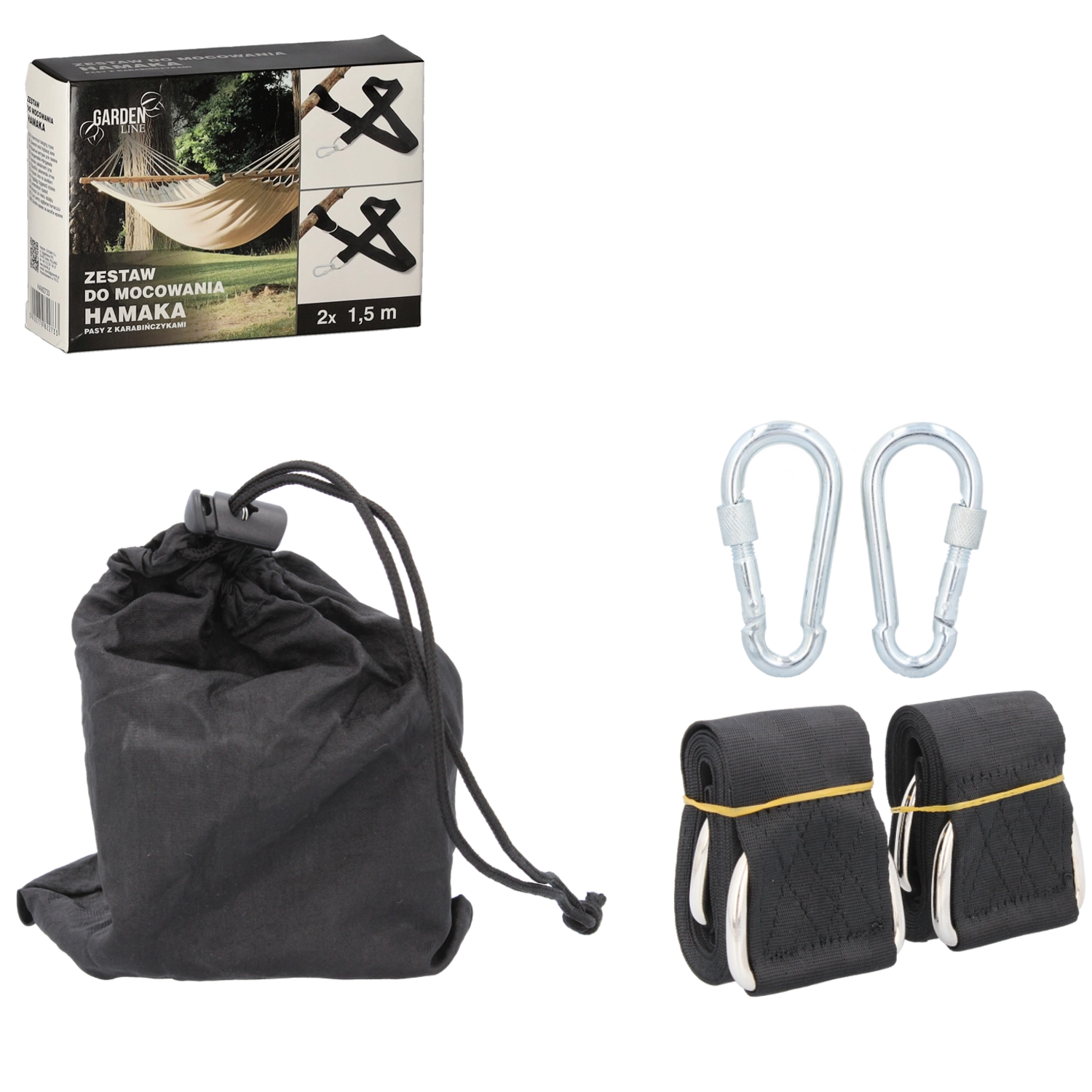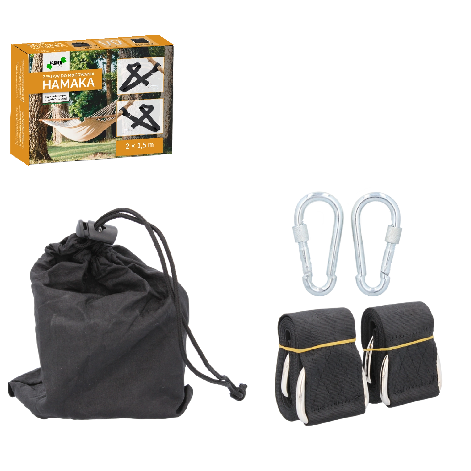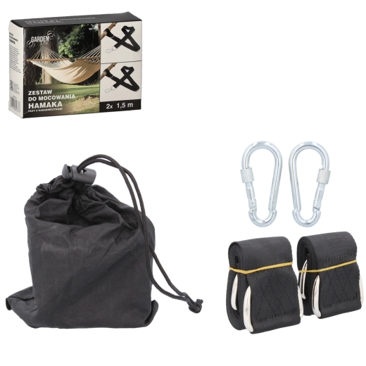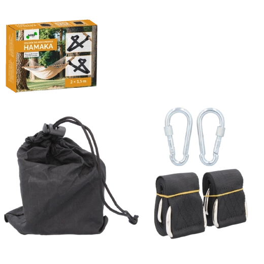 Megbízható hamac felfüggesztés percek alatt. A komplett szett hevederekkel, karabinerekkel és horgokkal stabilitást és kényelmet ad otthoni kertben, nyaralóban, erkélyen vagy kempingezéskor. A nagy teherbírásnak és a robusztus kivitelnek köszönhetően nyugodtan ringatózhat és relaxálhat.