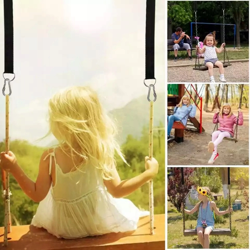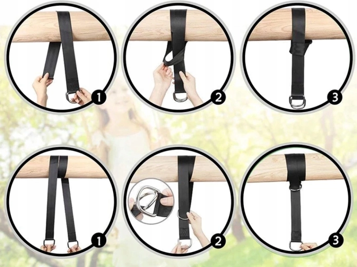 Tekerd a hevedert az ág vagy gerenda köré, fűzd át, majd rögzítsd a karabinerrel. Az egyszerű folyamat bárkinek megy szerszámok nélkül.