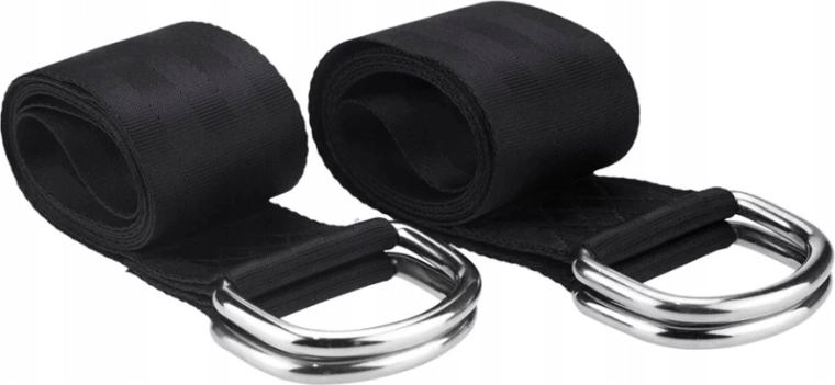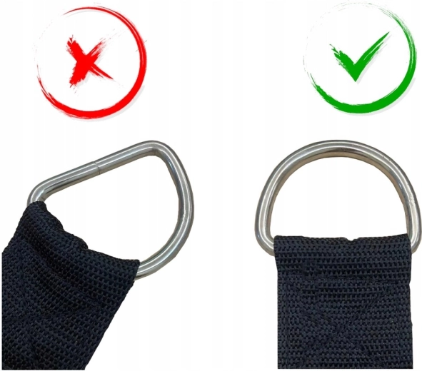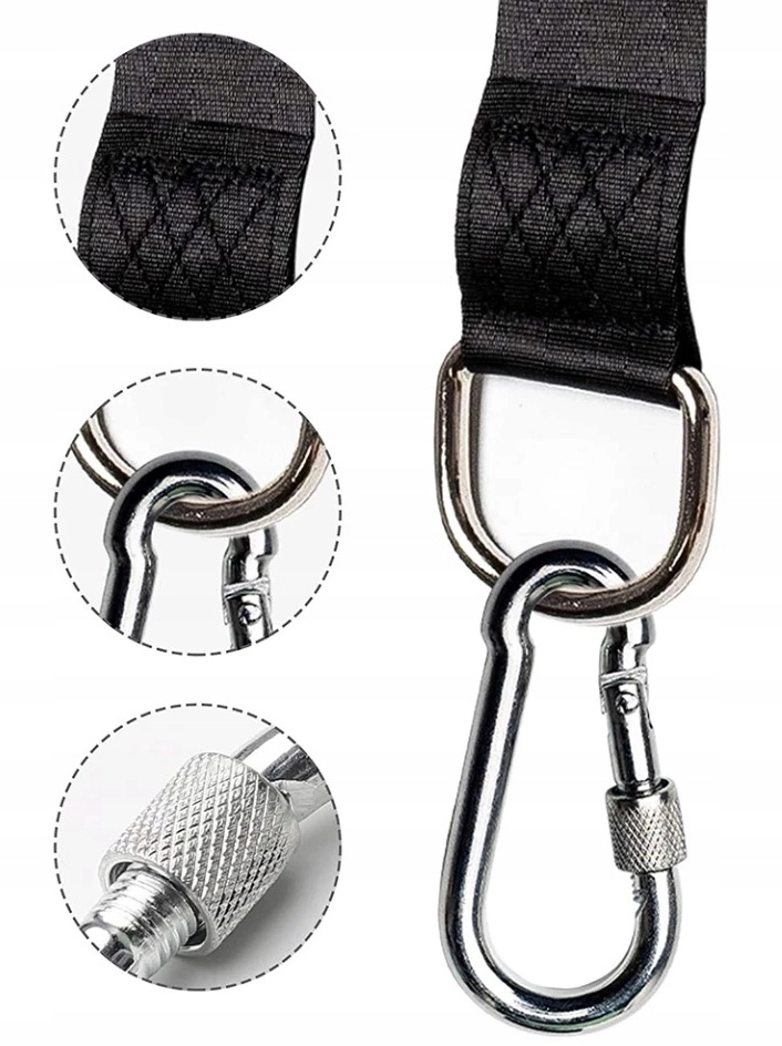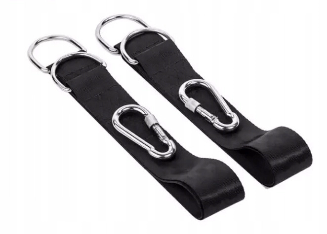 Erős hevederek fém D-gyűrűkkel és csavaros karabinákkal, amelyek nagy, akár 1000 kg-os terhelésnél is biztos tartást adnak.