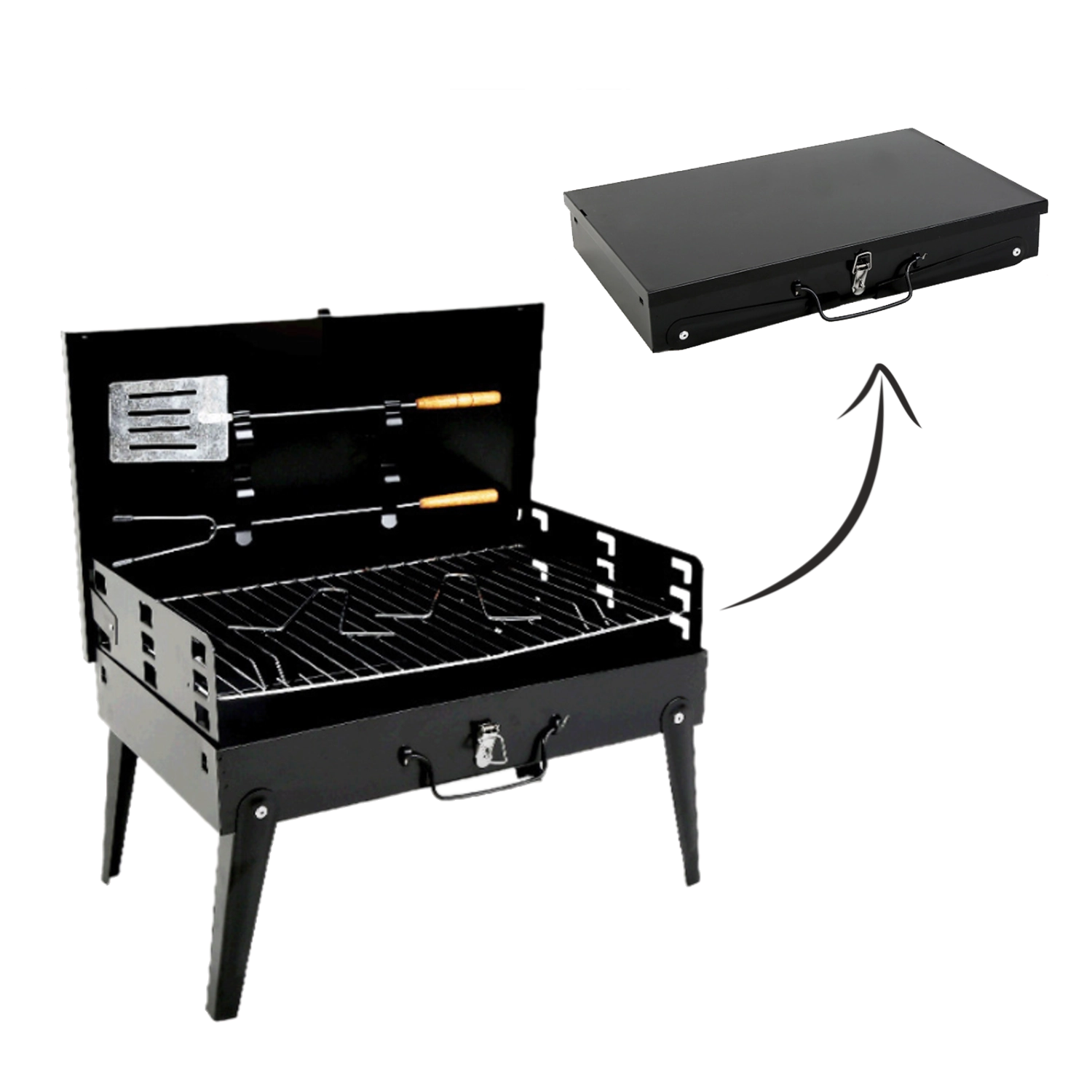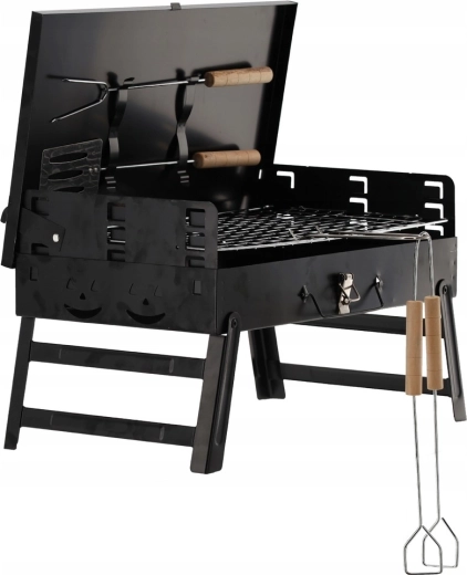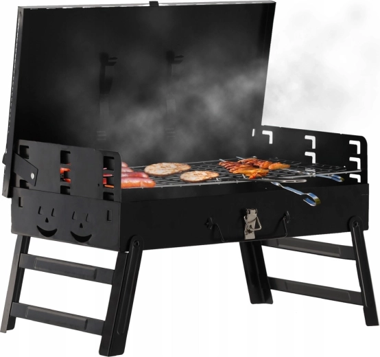 Kompakt, hordozható faszenes grill praktikus bőröndkivitelben kempinghez, piknikhez és kertbe. Az összecsukható lábaknak, a zárható fedélnek és az integrált eszközkészletnek köszönhetően a grillezés bárhol kényelmes és biztonságos. Stabil szerkezet, gyors összeszerelés és könnyű hordozhatóság – hely- és időtakarékos megoldás.