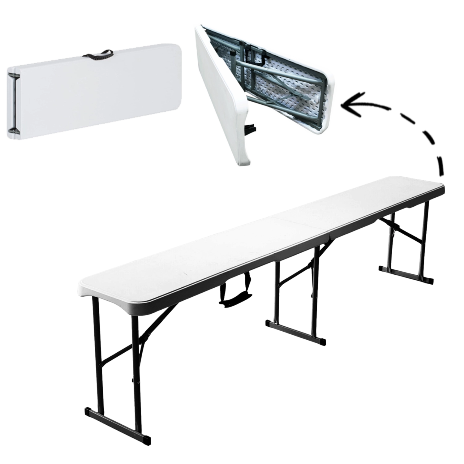 Ez az univerzális, 180 cm hosszú összecsukható pad kényelmes ülőhelyet biztosít 2–3 fő számára. A tartós HDPE ülőlap és a merevítésekkel ellátott, robusztus acél lábak kiváló stabilitást garantálnak beltéren és kültéren egyaránt. Félbehajtás és rögzítőpánt után a praktikus fogantyúnál fogva könnyen hordozható, és kisebb helyen is elfér.