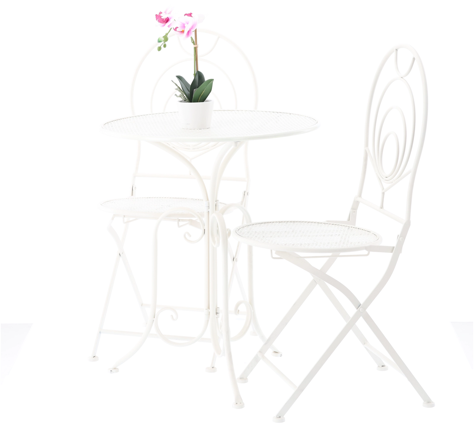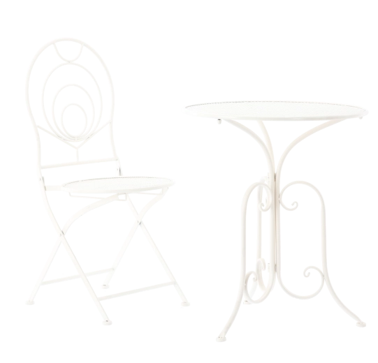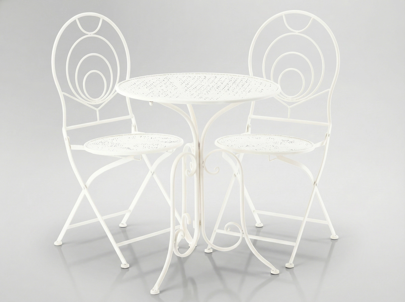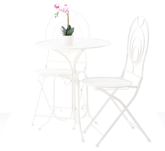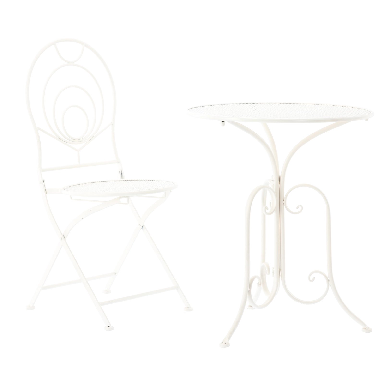 A díszített fém részletek és a tiszta fehér szín kifinomult bisztro megjelenést adnak az erkélynek, terasznak és kertnek, könnyen kombinálható kiegészítőkkel.